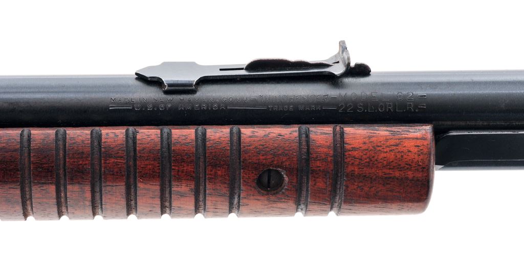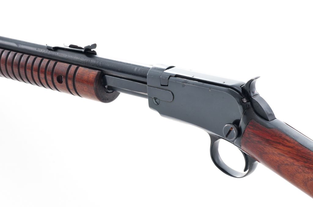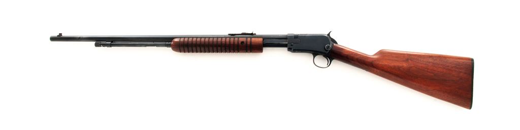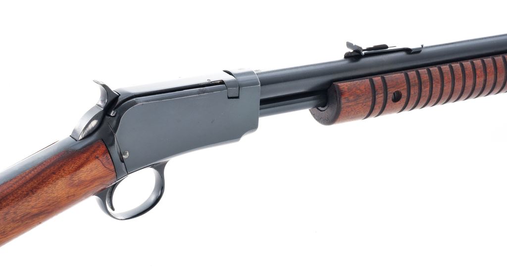 Winchester Model 62A Pump Action Rifle, #198576, .22 S-L-LR cal., 23'' barrel, blue finish, smooth walnut stock, 17-groove forend, factory checkered hard rubber buttplate, with standard sights. Mfg'd 1947. Condition is fine retaining approx. 96% blue with light high edgewear and thinning in actioning areas. Straight grain stock with light marks from field use. Good action, bright bore. Est.: $450-$650. (C&R)