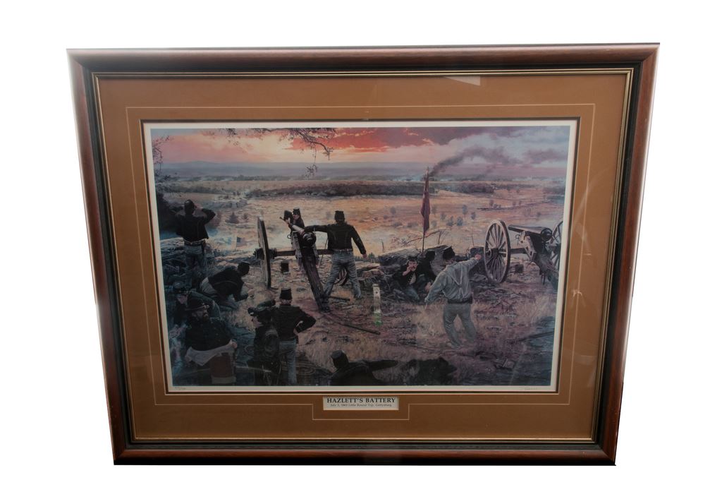 Beautifully Museum Framed and Matted Print, entitled ''Hazlett's Battery, July 2, 1863, Little Round Top, Gettysburg'', #373/750, hand signed by Dale Gallon, approx. 20''x30''. Condition overall is excellent. Est.: $400-$600.