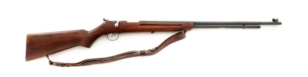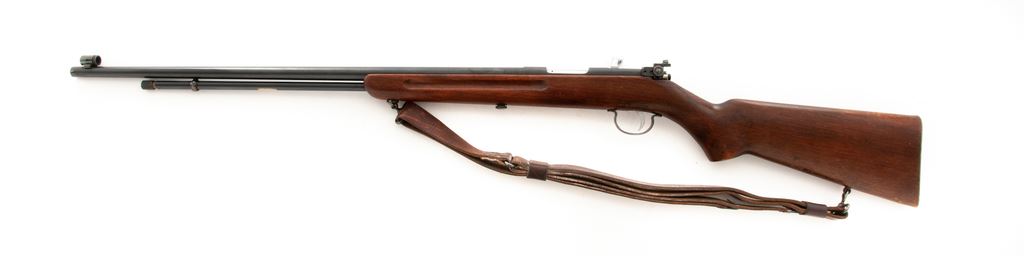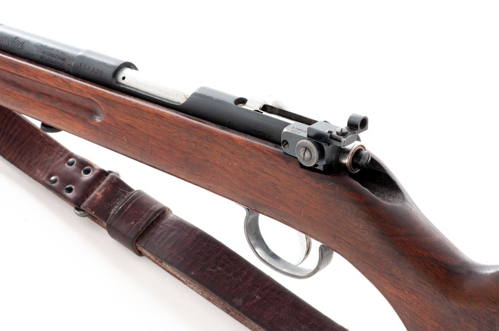 Remington Model 34 NRA Target Bolt Action Rifle, #108330, .22 S-L-LR cal., 24'' barrel, blue finish, finger-groove pistol-grip walnut stock, commercial leather sling, with Lyman 55 peep sight with globe type front sight. Condition is fine. Metal components contain approx. 94% blue. Stock with moderate thinning to varnish from handling. Good action, bright bore. Est.: $300-$500. (C&R)