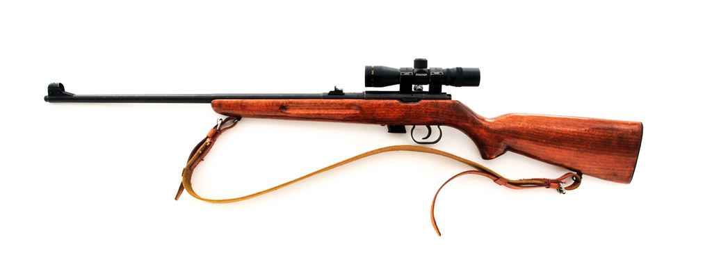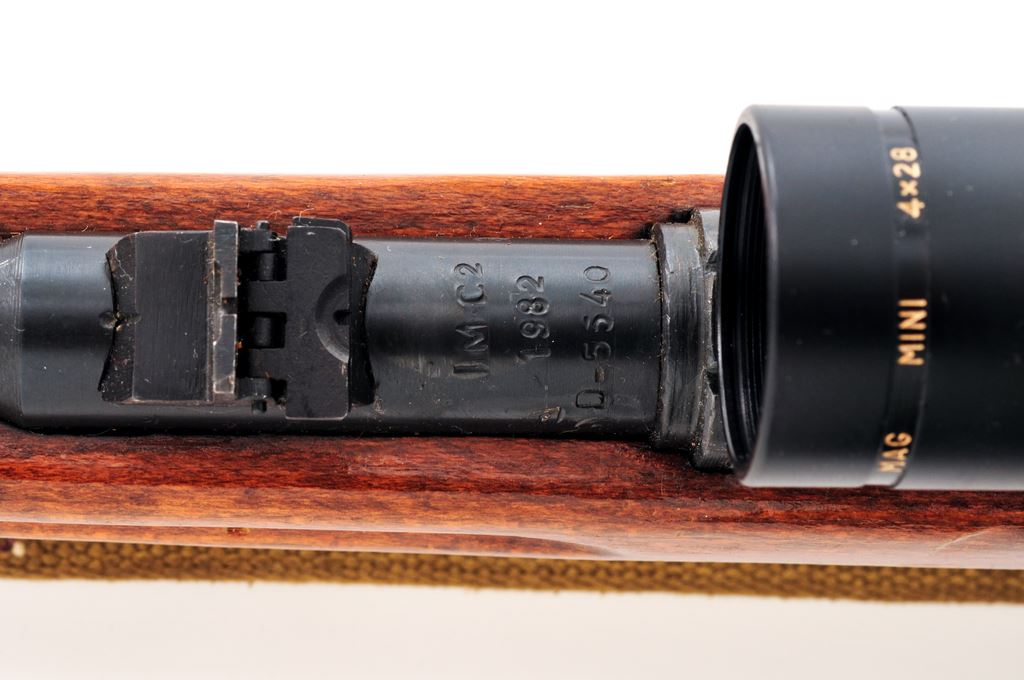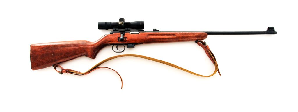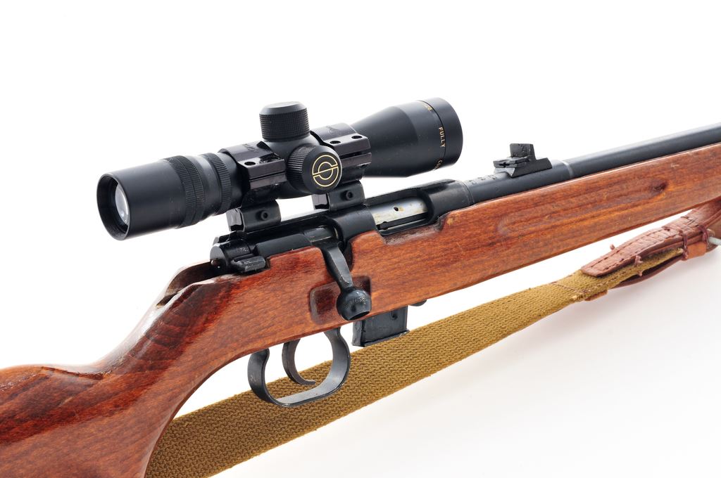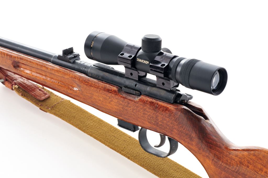 Romanian IMC-2 Model 69 Bolt Action Training Rifle, with scope, #D5540, .22 LR, 23'' barrel, blue finish, one-piece pistol-grip wood stock with grooved forend, hooded silver bead front sight, three-leaf rear sight (one fixed, and two folding), factory grooved receiver, with a Simmons Mini .22 Mag. 4x28 scope with duplex reticle. Included is one magazine and canvas military type sling with leather collars. Right side of barrel is import marked. Most of the blue finish remains, with scattered small nicks and scratches; factory lettering is clear. Wood with moderate handling marks, with an added coat of varnish. Good action, bright bore with excellent rifling. Scope is also excellent with clear optics. There is some adhesive or possibly sealant visible along the edges where the scope rings touch the scope. Est.: $125-$225. (Modern)