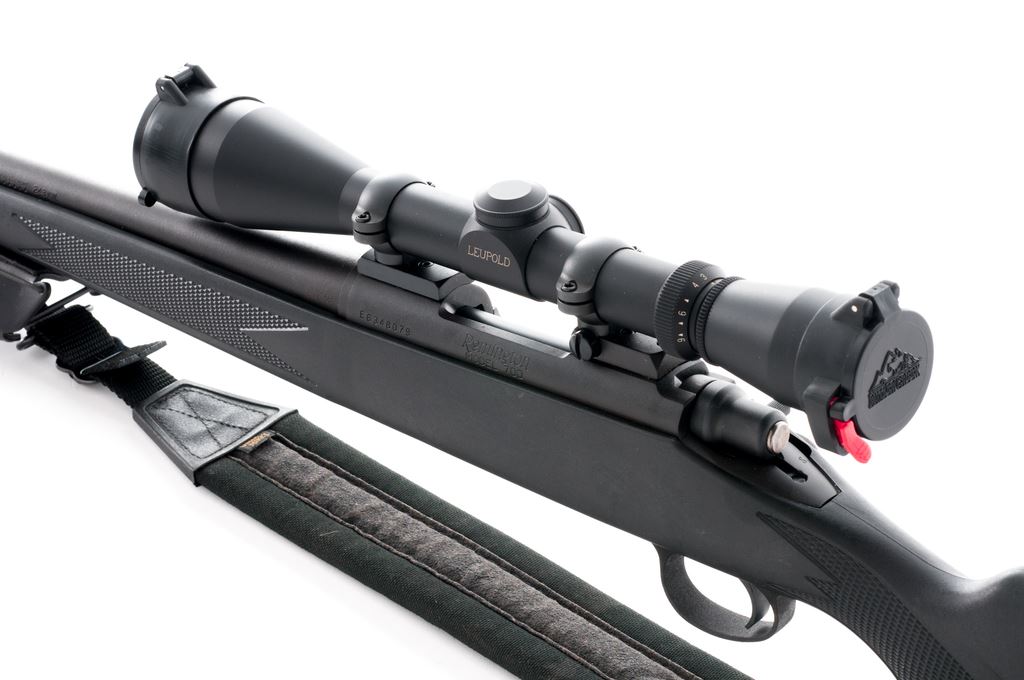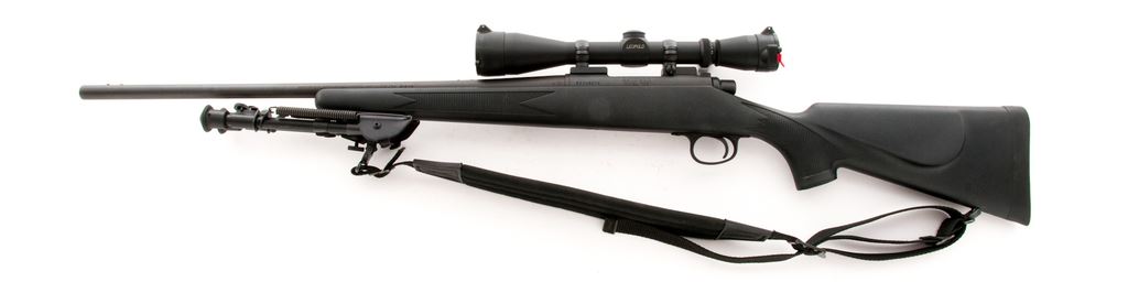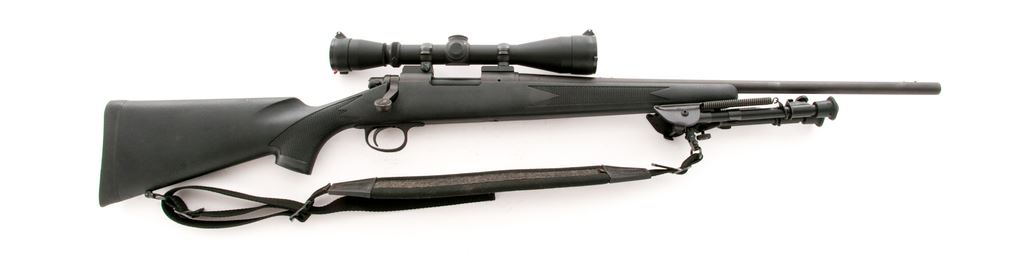 Remington Model 700 Bolt Action Rifle, with Leupold scope, #E6348079, .243 cal., 22'' barrel, matte blue/black finish, checkered black synthetic pistol-grip stock with cheekpiece, black rubber Remington recoil pad, quick-release sling swivels, black nylon Cordura Uncle Mike's sling, adjustable bi-pod, and topped with a Leupold Vari-X II 3x9 scope with duplex reticle and Butler Creek lens covers. Rifle is in excellent overall condition showing only a few normal slight handling marks to the stock and metal. Factory lettering and stock checkering is clean and sharp. Action is smooth with a mirror bright bore. Scope is also excellent with bright, clear optics. Est.: $450-$650. (Modern)