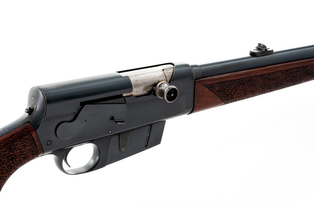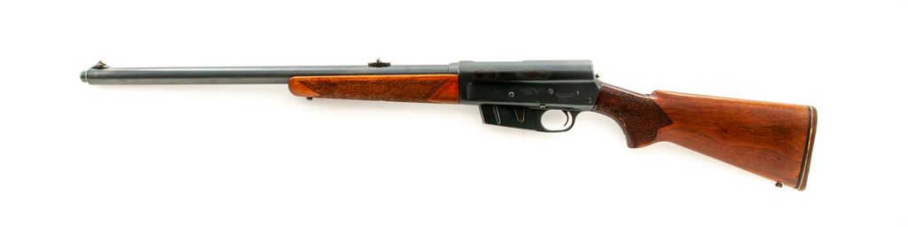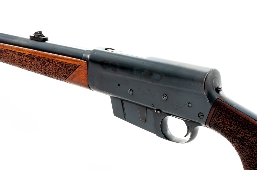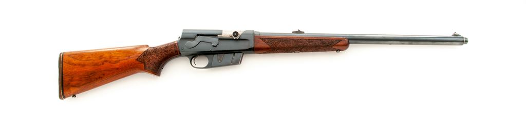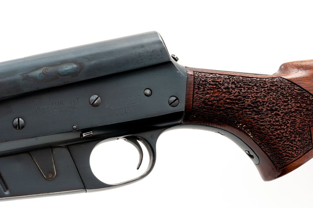 Remington Model 81 Woodmaster Semi-Automatic Rifle, #23631, .300 Sav. cal., 22'' barrel, blue finish, non-factory carved walnut stock, with period added Dupont brown rubber butt pad. Condition is very good retaining approx. 92% factory blue. Left side of receiver has had four holes that have been later plugged. Pistol grip and forend with nicely accomplished later-added peening for better grip. Action is good, bore is fine. Est.: $250-$450. (C&R)