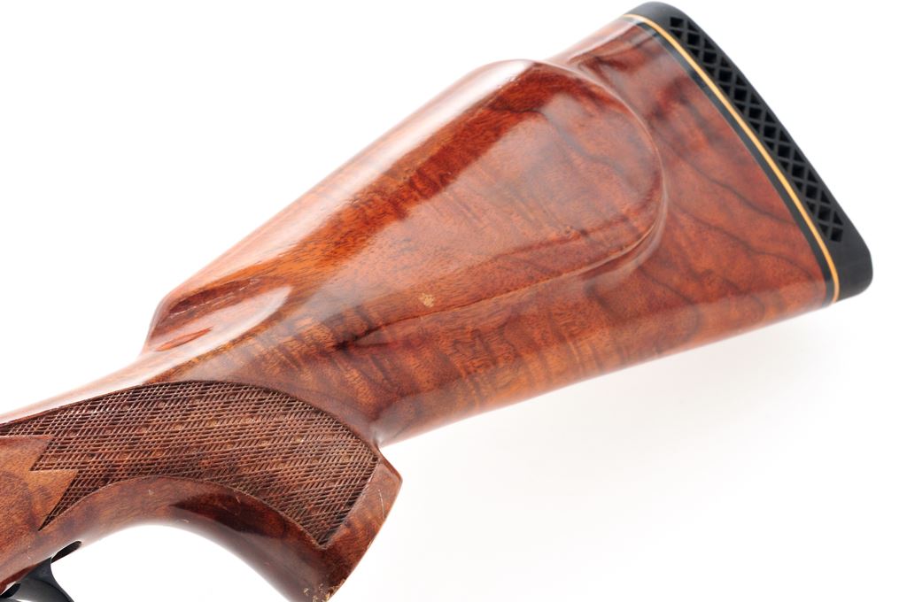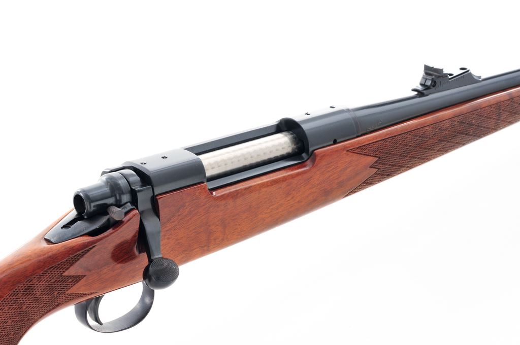 Remington Model 700 Bolt Action Rifle, #6865837, 7mm Rem. mag. cal., 24'' barrel, blue finish, dovetailed brass bead front sight on ramped base, and sliding ''U''-notched rear sight also on a ramped base. Gloss-finished pistol-grip walnut stock with skip-line checkering, Monte Carlo cheekpiece, and black rubber Remington recoil pad. Top of receiver is factory drilled and tapped for a scope mount. Approx. 99% original blue finish remains and metal surfaces are in excellent overall condition. Triggerguard with scattered small scratches. Factory lettering is clear. Wood is very good with intermittent small handling marks and over 96% gloss finish, showing some thinning around the edges of the pistol grip and a minor spot of flaking on the cheekpiece. Action is smooth with a excellent bright bore that shows signs of little use; internally a really clean rifle. Est.: $400-$600. (Modern)
