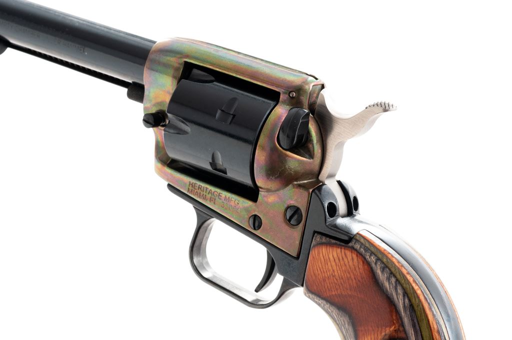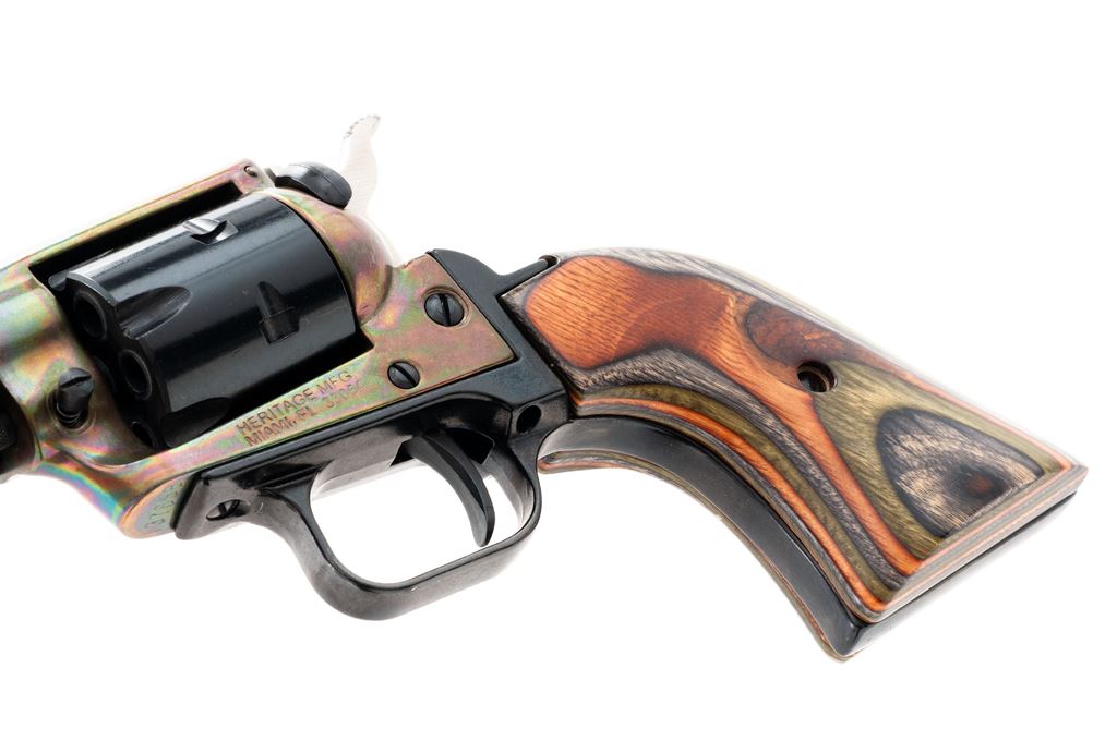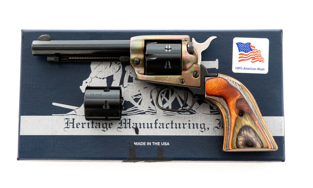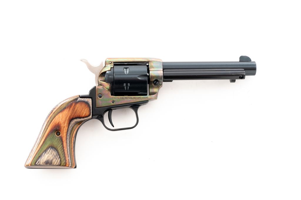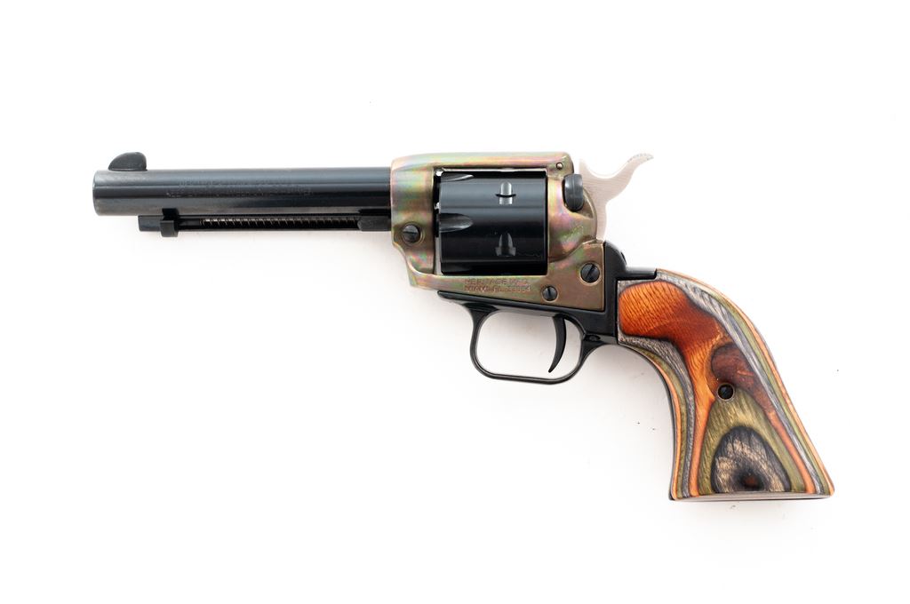 Heritage Rough Rider Single Action Revolver, #137658, .22 LR/.22 mag cal., 4.75'' barrel, blue and colored receiver, laminated wood grips, in original box with instructions. Condition is excellent, appearing as new and unfired. Est.: $250-$400. (Modern/PPT)