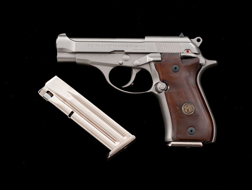 Beretta Model 81 Semi-Automatic Pistol, #D04694W, .32 cal., 3.75'' barrel, electrolus nickel finish, smooth factory hardwood grips, with two (2) nickel high-capacity magazines. Condition is excellent showing little use. Grips with minor marks from handling. Good action, bright bore. Est.: $300-$500. (Modern)(Not available to Calif. residents.)