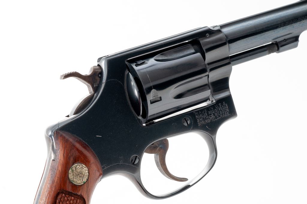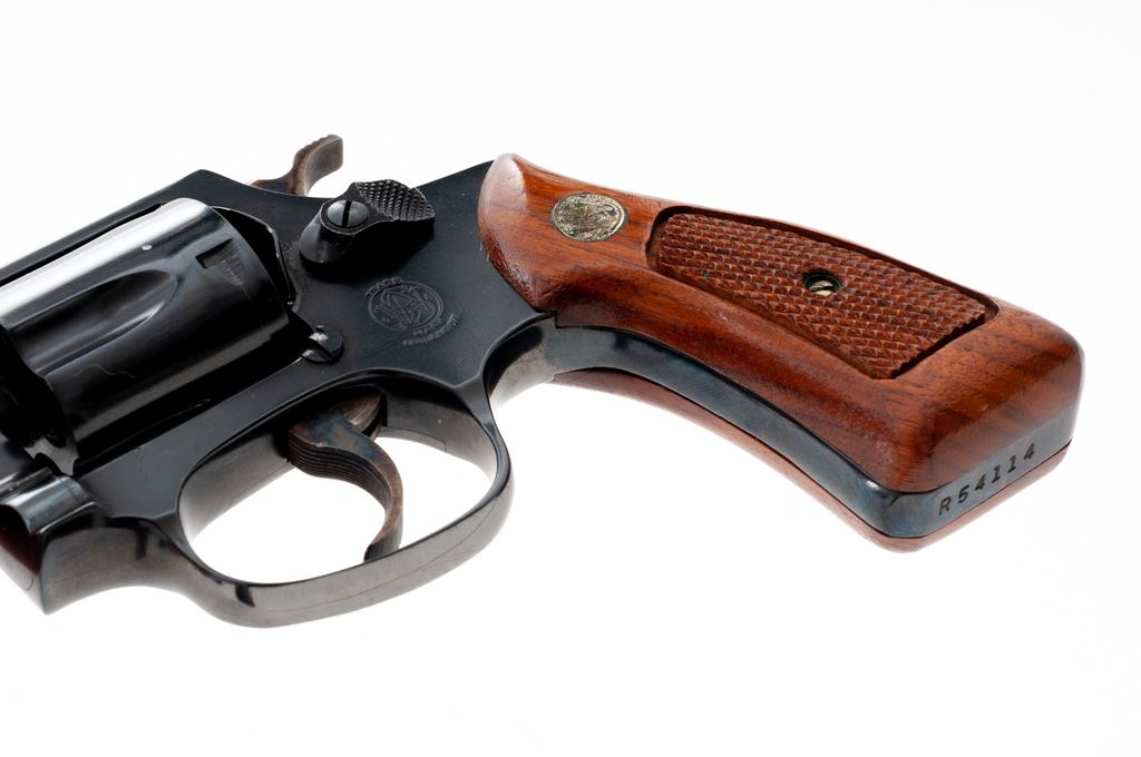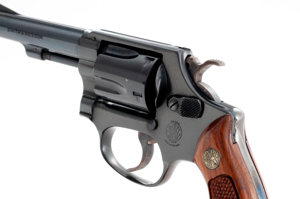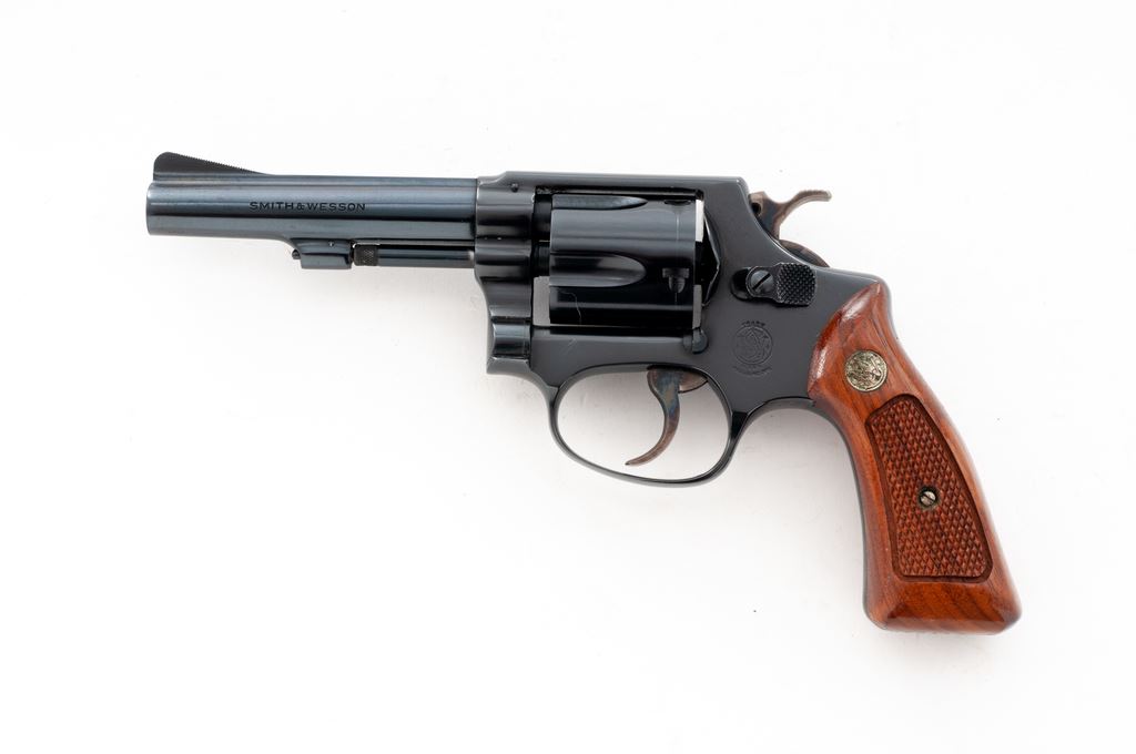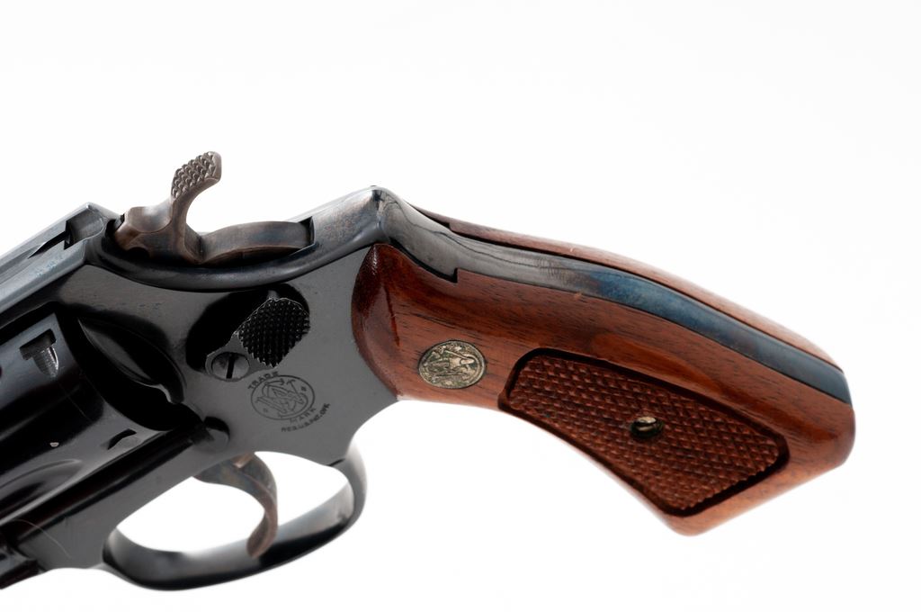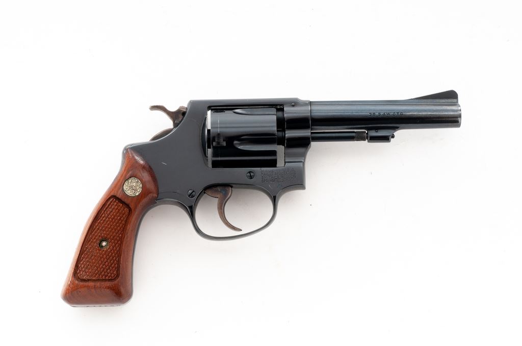 Smith & Wesson Model 33-1 Double Action Revolver, #R54114, .38 S&W cartridge, 4'' pinned barrel, blue finish, factory checkered walnut grips with S&W medallions. Condition is excellent retaining approx. 97% blue. Small scratch above left triggerguard bow. Crisp grips and action, bright bore. Est.: $350-$500. (Modern/PPT)
