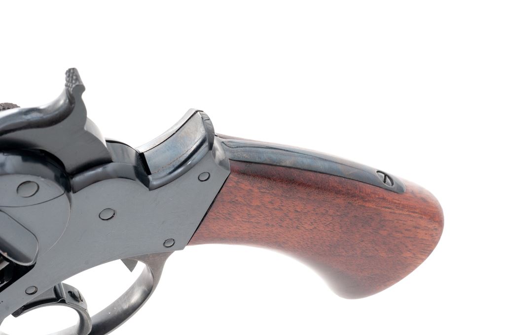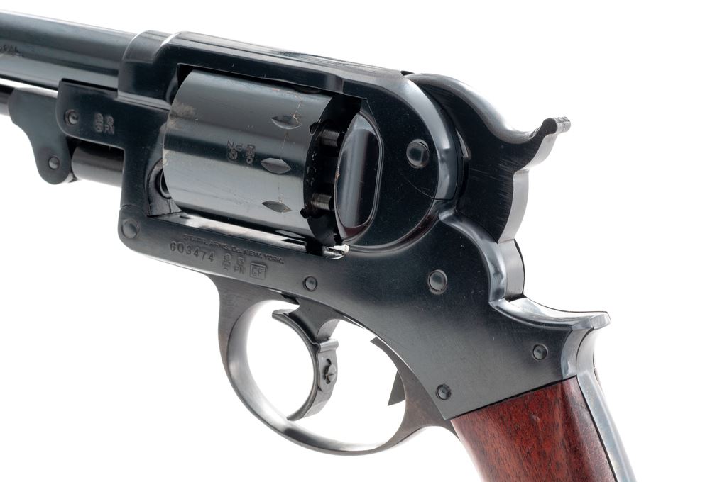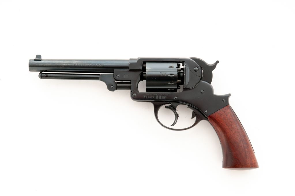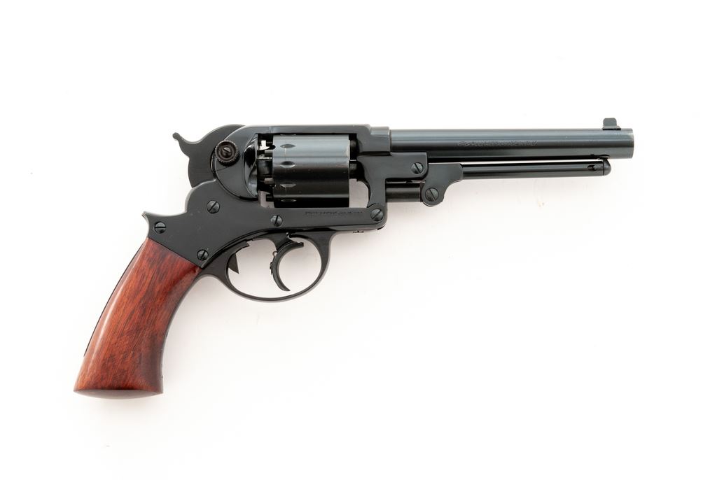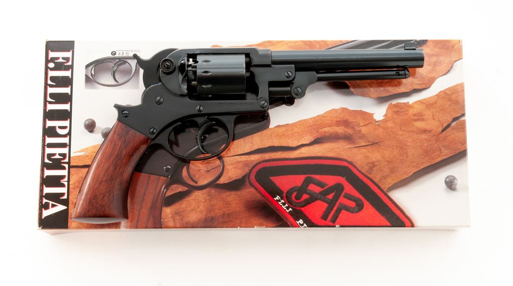 F.LLI Pietta Reproduction Starr Model 1858 Percussion Black Powder Revolver, #G03474, .44 cal., 6'' barrel, dark blue finish, one-piece smooth walnut grip, with standard sights. In original box that is hand numbered to the gun, with owner's manual. Made in Italy. Condition is excellent with approx. 98% remaining original blue finish; cylinder with a thin index line. Factory lettering is crisp and clear. Grips with normal scattered shallow handling marks. Excellent action and bright bore. Est.: $300-$500. (No FFL Required)