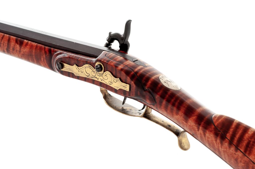 Contemporary American Fullstock Percussion Kentucky Rifle, by Knetsche, NVSN, .45 cal., 43'' octagonal barrel is marked ''P. Knetsche/Cheraw, S.C.'' in two lines on top flat, dovetailed low-blade German silver front sight and dovetailed notched rear sight; the unmarked percussion lockplate and hammer with sparse engraved decoration; brass furniture including ornately pierced and engraved patchbox with hinged lid, buttplate with engraved lower extension, triggerguard, sideplate and three round ramrod ferrules. Double set triggers. The artificially tiger-striped maple fullstock with carved and incised decoration including raised cheekpiece, inset German silver plate at wrist marked ''1972/PHK'', and large brass nosecap. Condition is excellent, the browned barrel and lockplate retaining all of their original finish, and brass parts with a light patina. Stock is solid, unmarked and with fine coloration and nice semi-gloss finish. Action is tight and crisp; bore appears bright with deep rifling. Est.: $350-$650. (Antique)