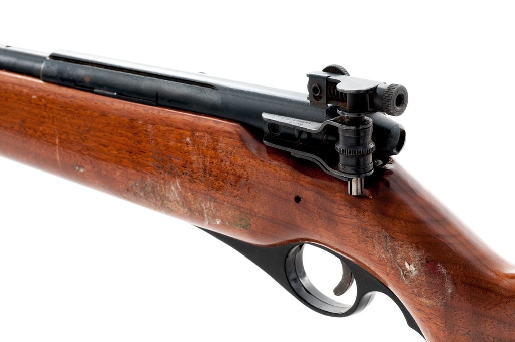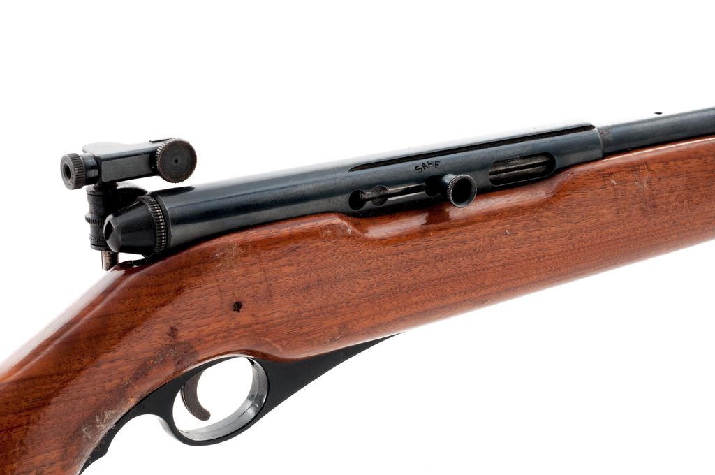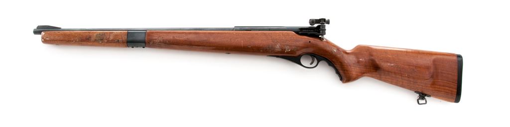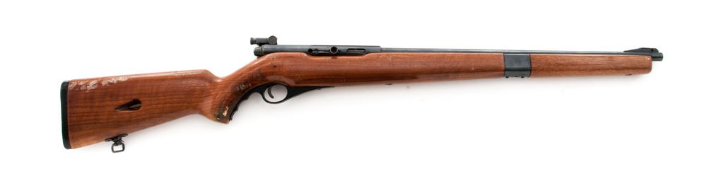 Mossberg Model 151M-B Semi-Automatic Rifle, NVSN, .22 LR cal., 20'' barrel, blue finish, pistol-grip hardwood stock, black composite buttplate, target front sight and receiver mounted S-130 peep sight, factory grooved receiver, rear barrel mounted sight has been removed. Metal surfaces are very good with approx. 96% blue finish. Left side of receiver with a few very small rust spots; factory lettering is clear. Finish on stock is gummed up and tacky in several areas and appears to have been applied and not properly cured before handling and possibly putting in a gun sleeve, otherwise the wood is relatively smooth with normal scattered handling marks. Action is smooth with an excellent bore. Est.: $125-$250. (C&R)