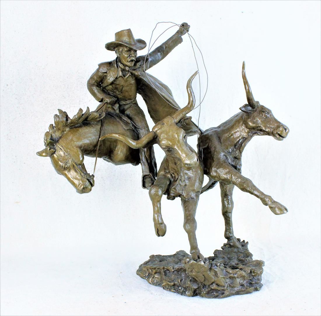 Nicely presenting action filled bronze depicting cowboy roping longhorns. With attractive finish and dimensions 17"x 17"x 11".