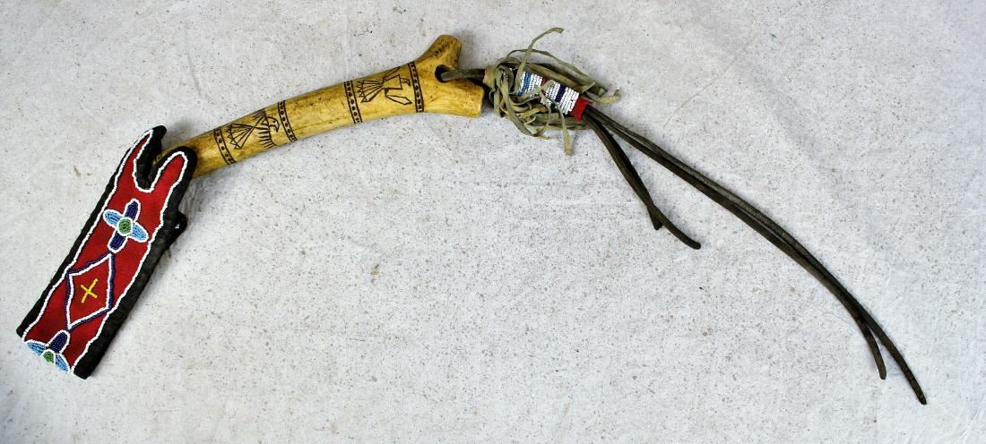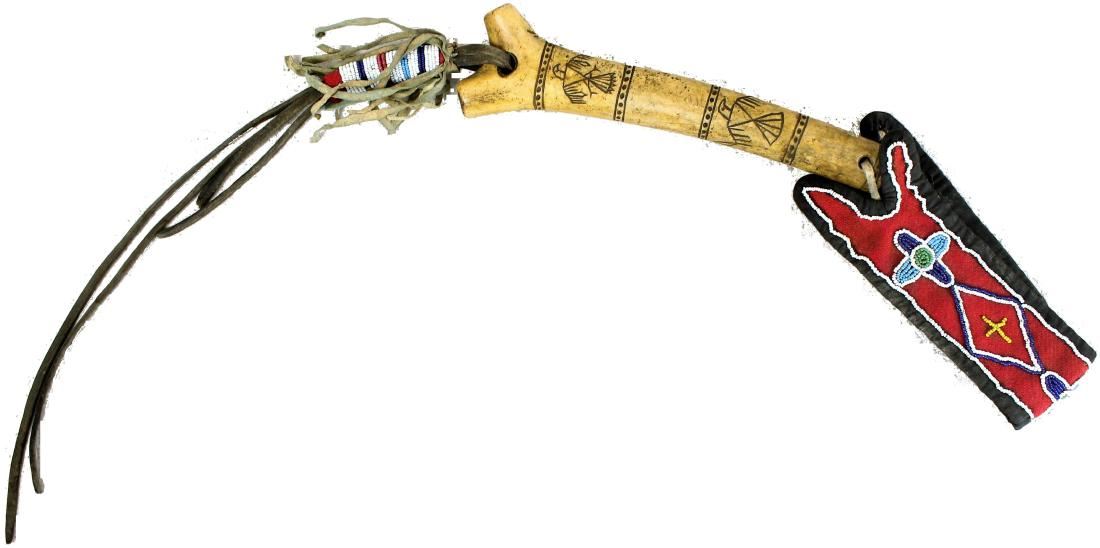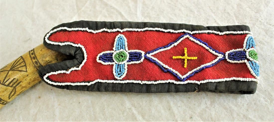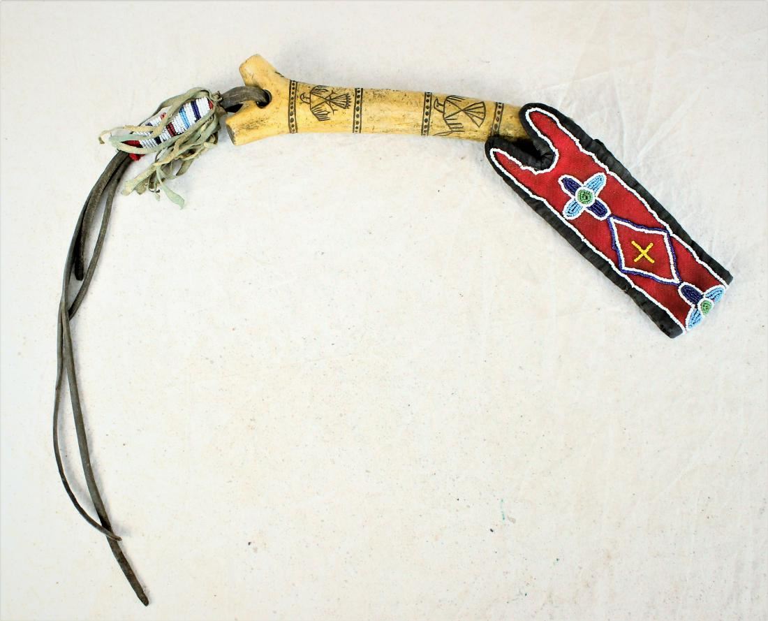 Dazzling Crow indian antler quirt with beautifully detailed figural incised eagles, flat beaded trade cloth wristband, and beaded horse harness popper. Showing wonderful age, wear and patina.