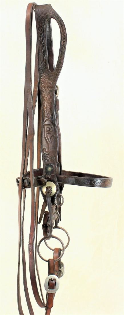 Terrific wide cheek flower tooled one ear headstall with Buerman iron globe bit in nice condition.