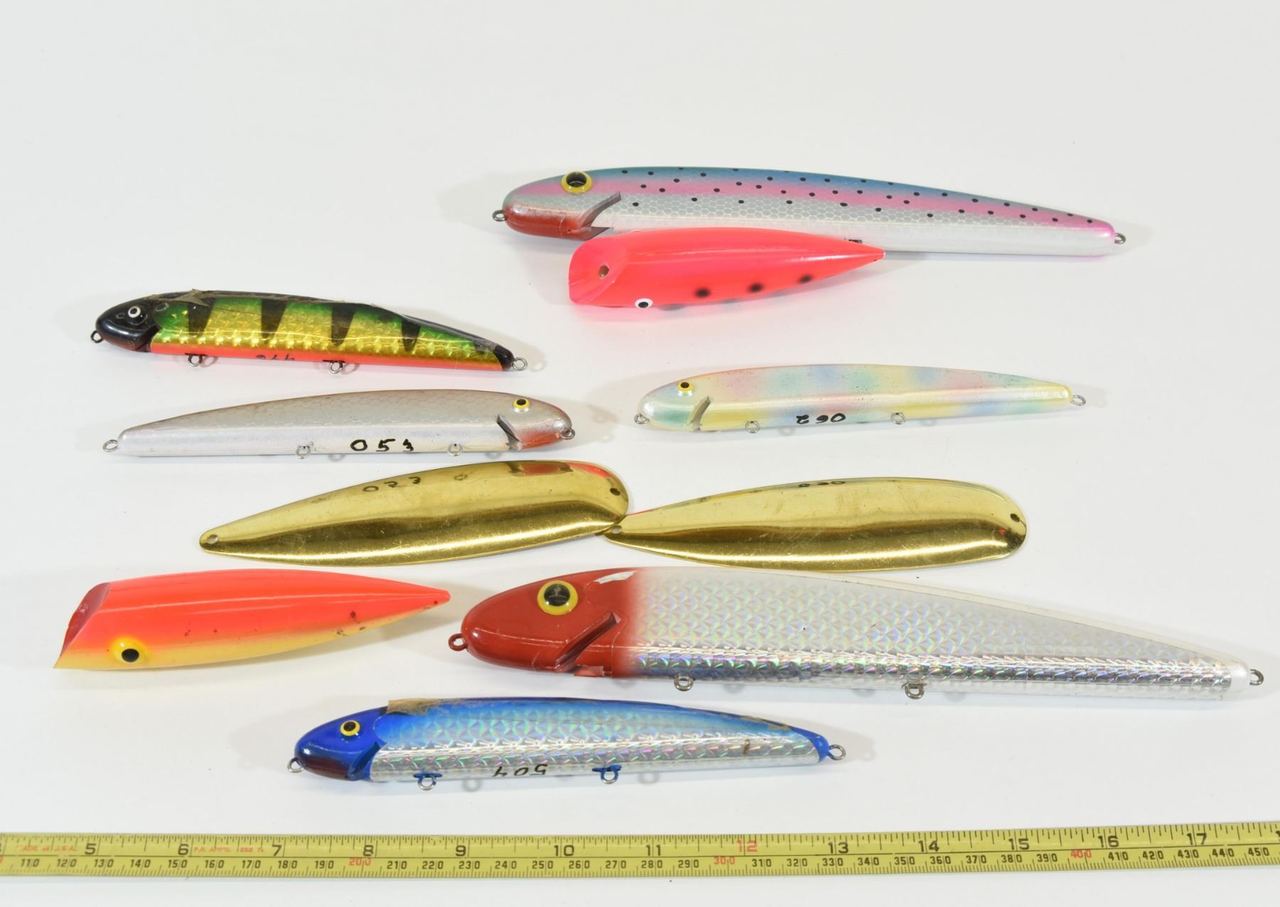 An assortment of 10 different sized lures with no hooks or diving blades.