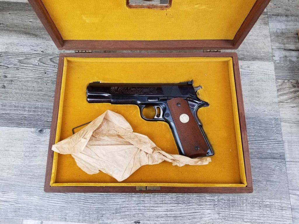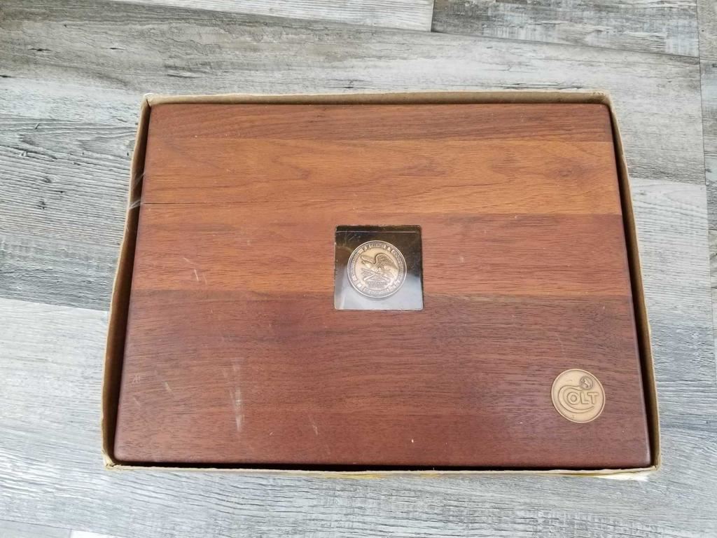 GUN LOOKS TO HAVE BEEN MINT AND PLACED IN COLT WOOD BOX. BOX HAD TO OF GOTTEN WET INSIDE AS NOW THERE ARE RUST SPOTS AND PITTING IN AREAS. DOES COME WITH SAID BOX. MORE OF A SHOOTER GRADE AT THIS POINT. MINT BORE.