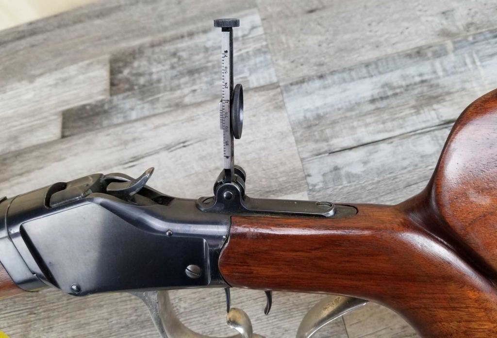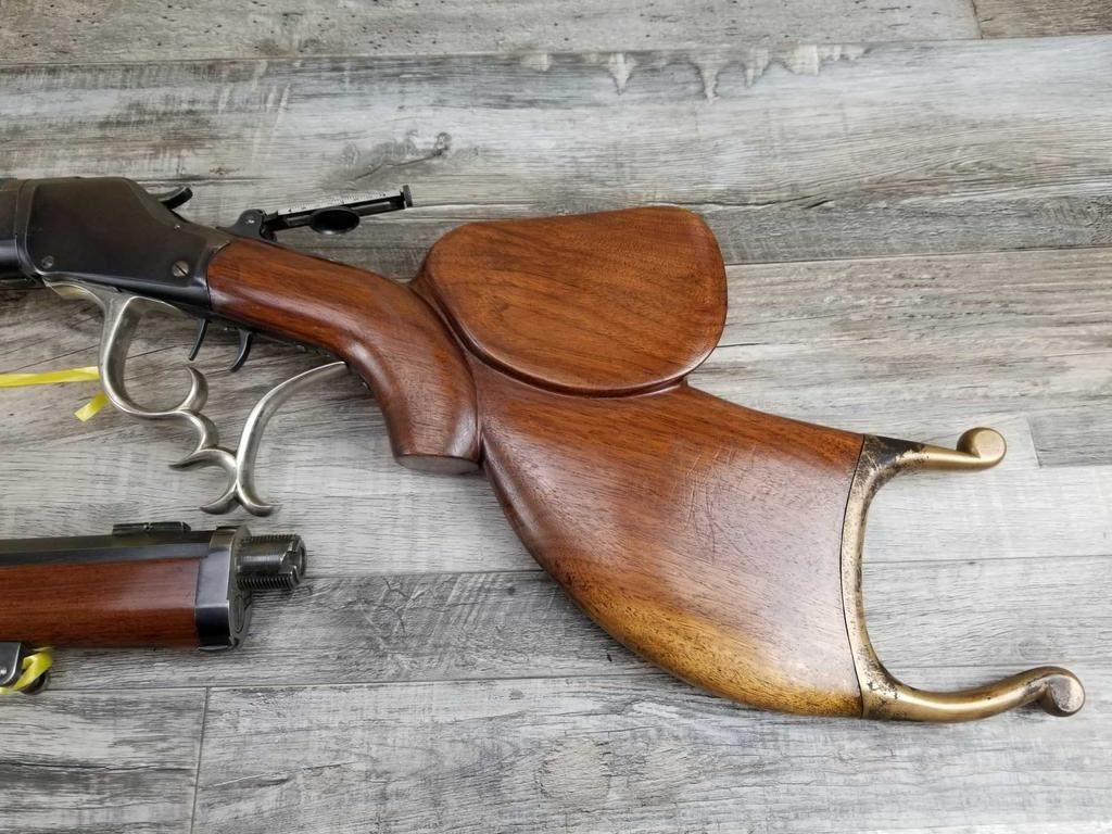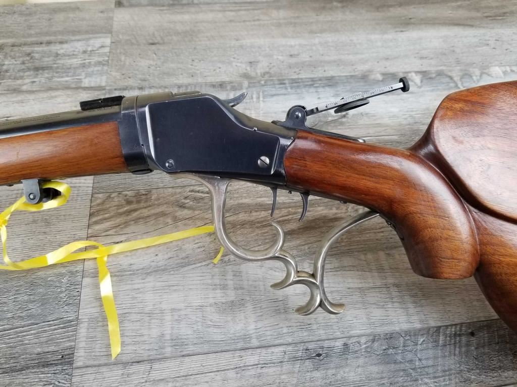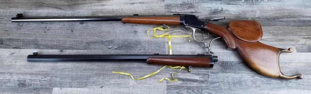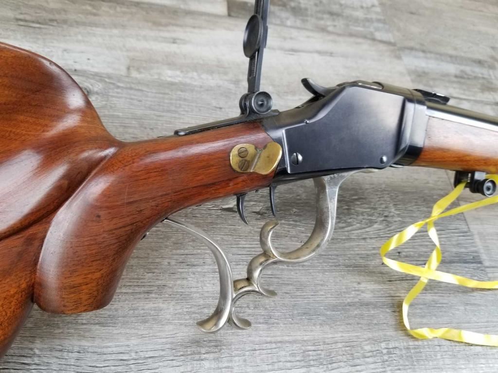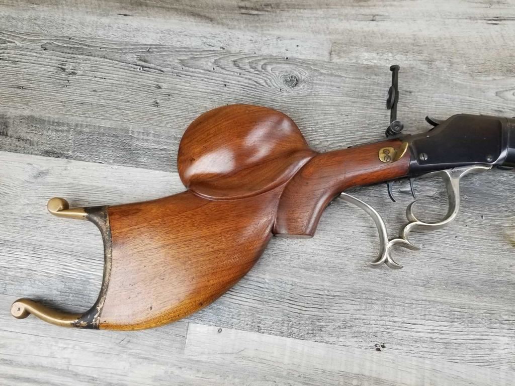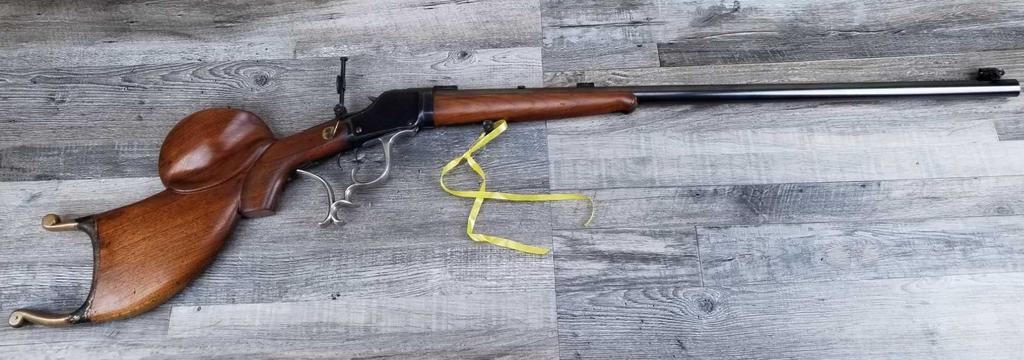 TAKE DOWN MODEL. TWO BARRELS. VINTAGE REAR PEEP SIGHT. SCHEUTZEN STYLE FANCY STOCK WITH SAME TYPE LEVER. DOUBLE SET TRIGGERS. BORE IS EXCLLENT.