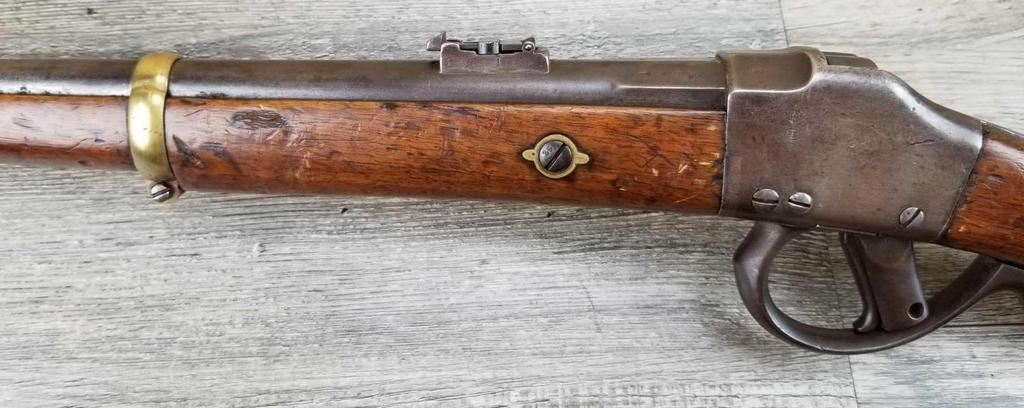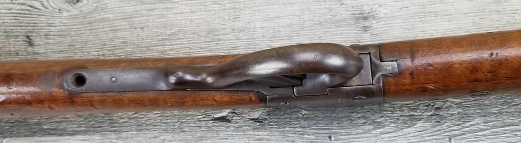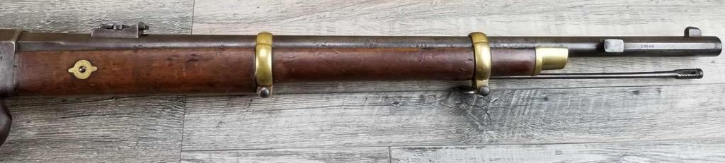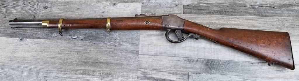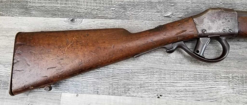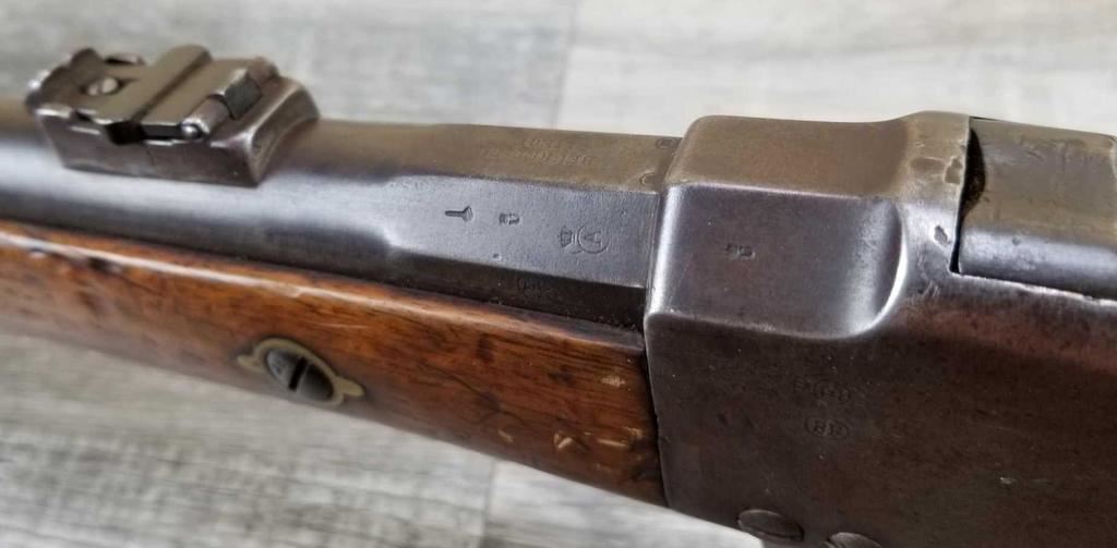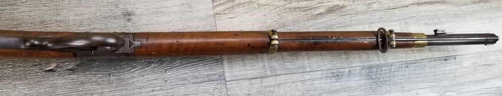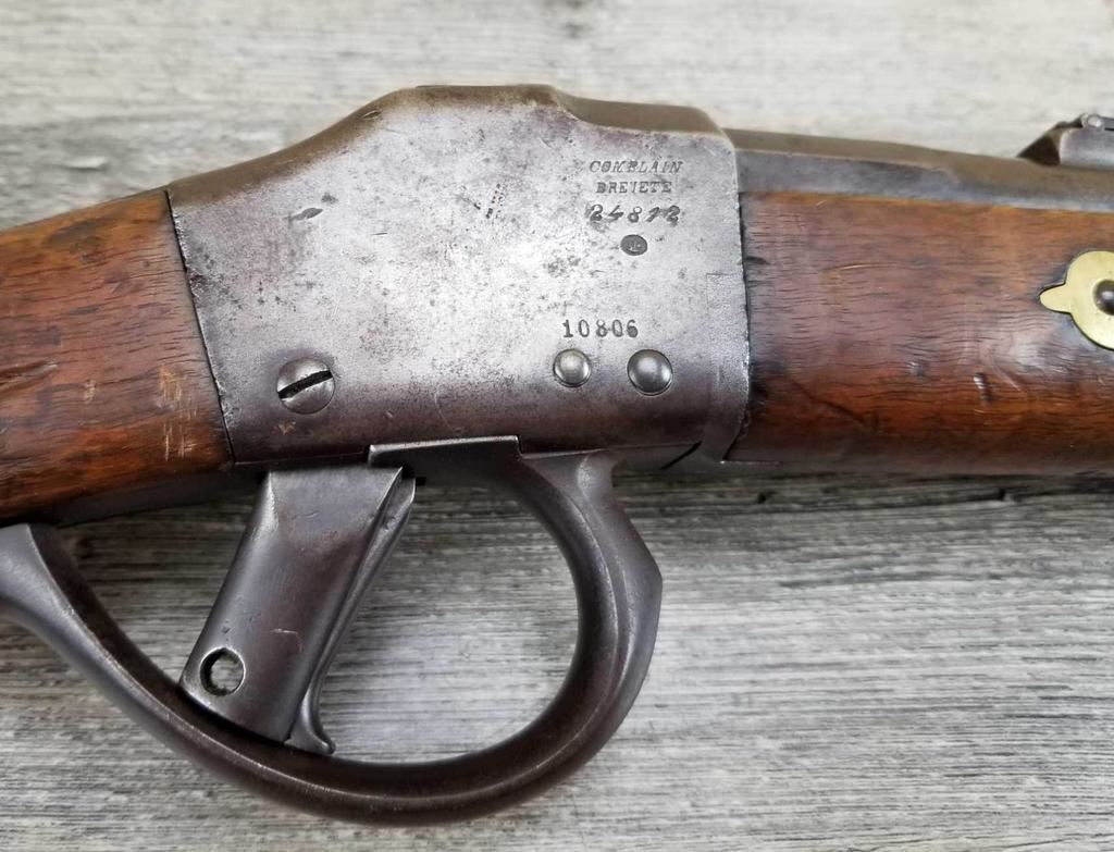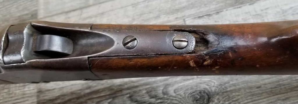 MISSING WOOD BEHIND UPPER TANG. BELGIAN MARKINGS. DOES NOT APPEAR TO BE WORKING. BORE IS GOOD.