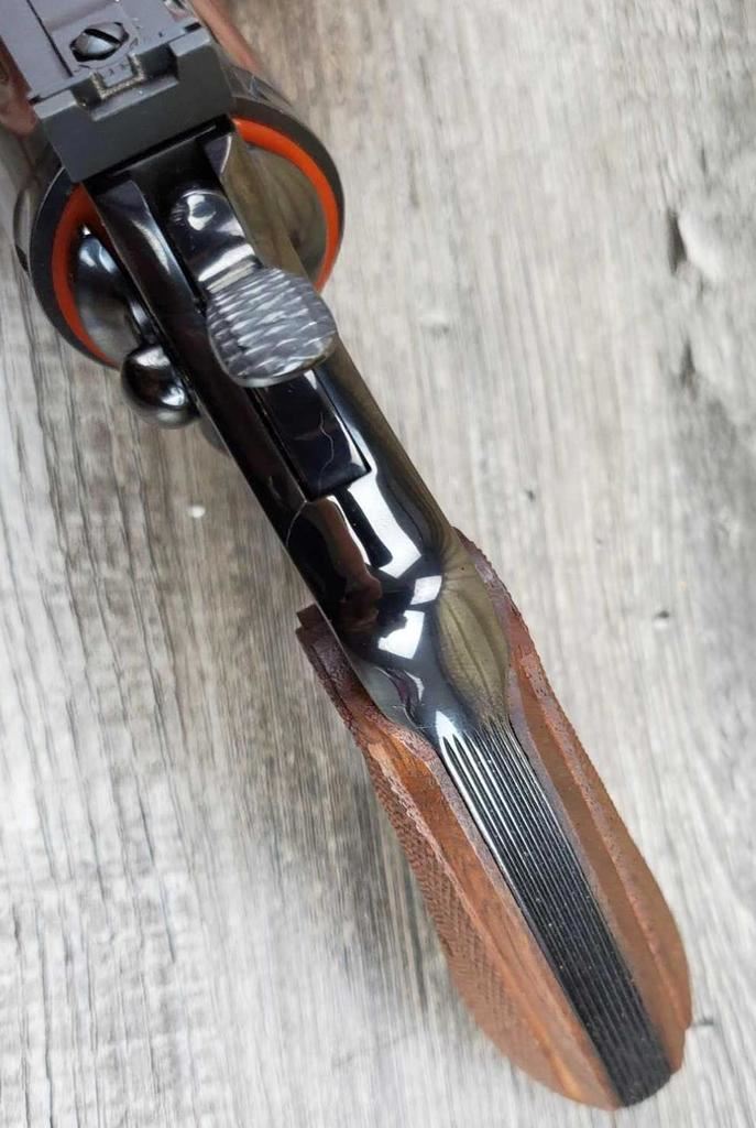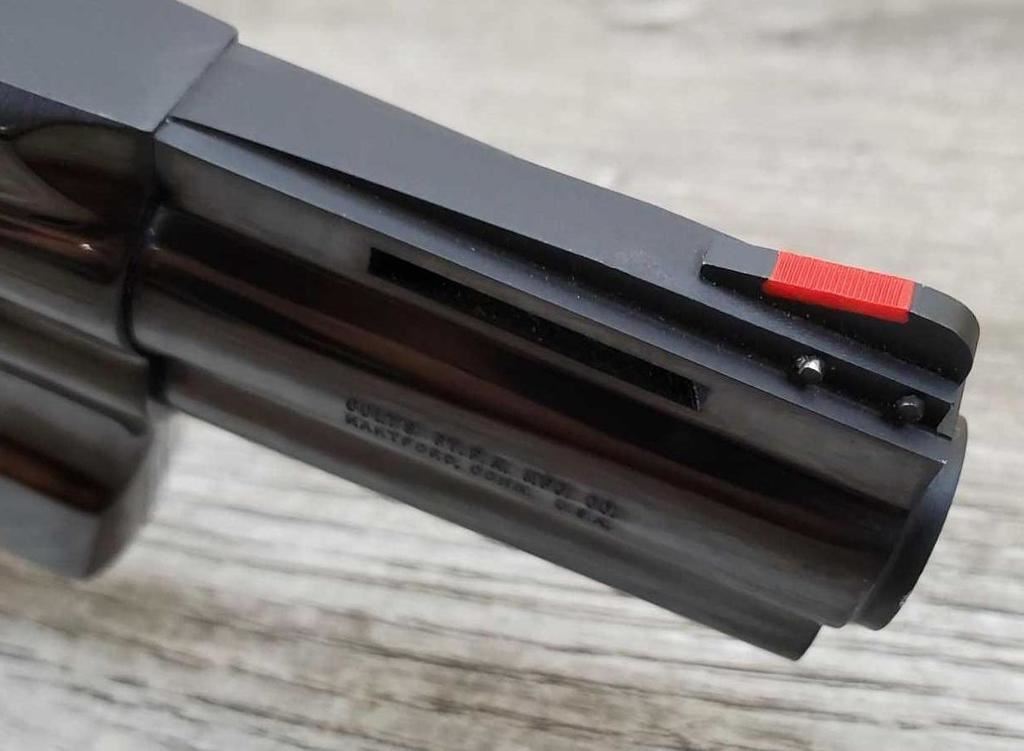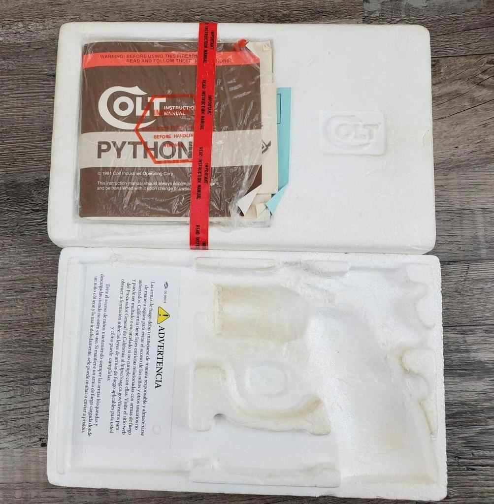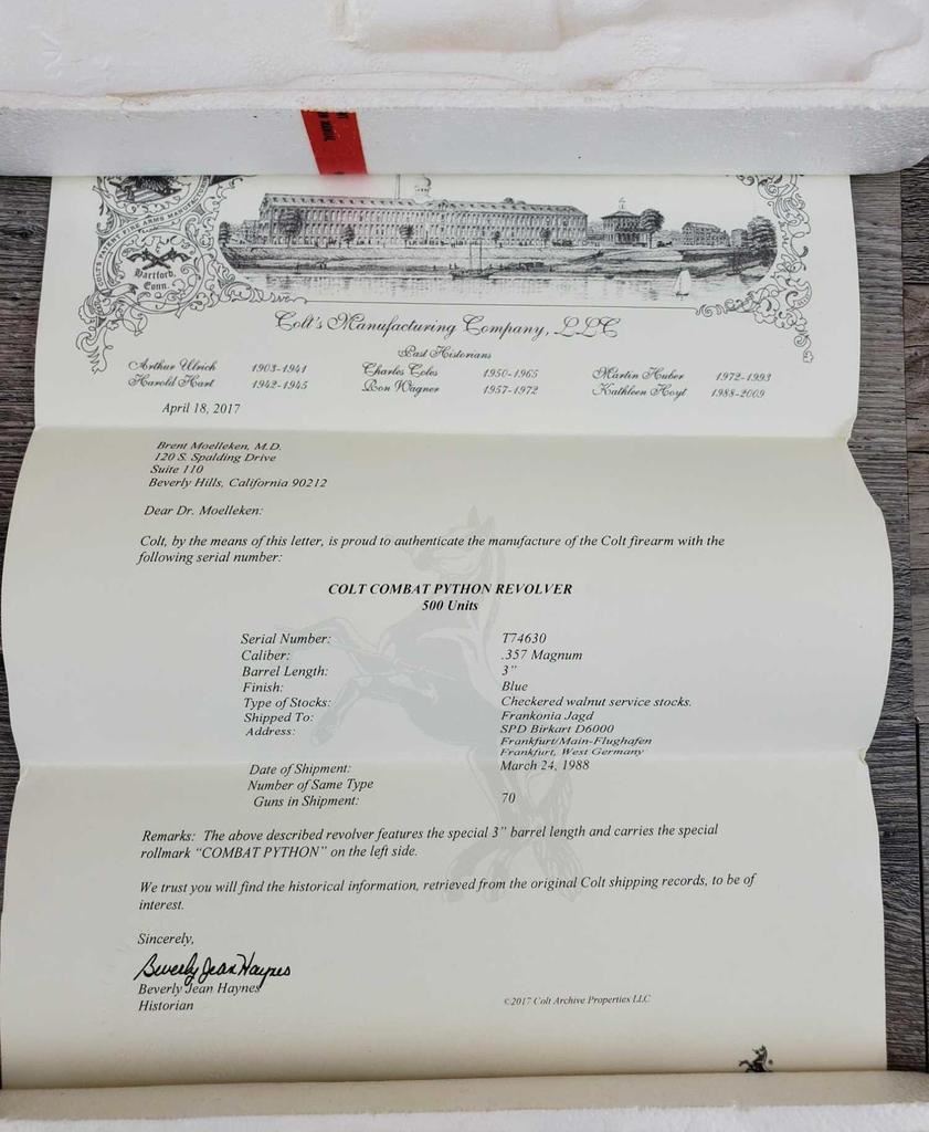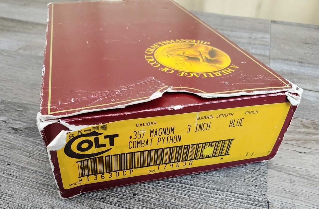 HAS ONLY THE SLIGHTEST LINE AROUND CYLINDER AND LIGHT WEAR AT BOTTOM OF CRANE FROM OPENING. OTHERWISE AS NEW, IN BOX. COMES WITH FACTORY LETTER, STATING IT IS IN FACT A REAL 3in, SHIPPED TO FRANKFURT GERMANY ON MARCH 24, 1988. AN ULTRA RARE VERSION OF THE COLT PYTHON. COMES IN FACTORY BOX WITH PAPERWORK.