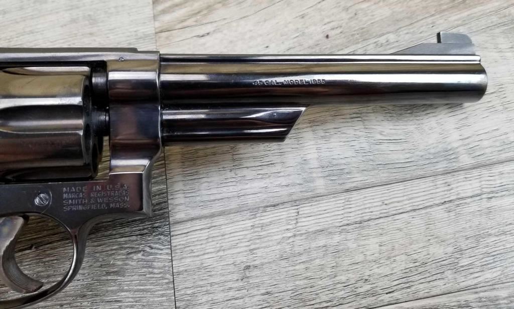 SOME FRECKLING DOWN BARREL. MARKED MODEL 1955 ON BARREL. REPLACEMENT GRIPS. MINT BORE.