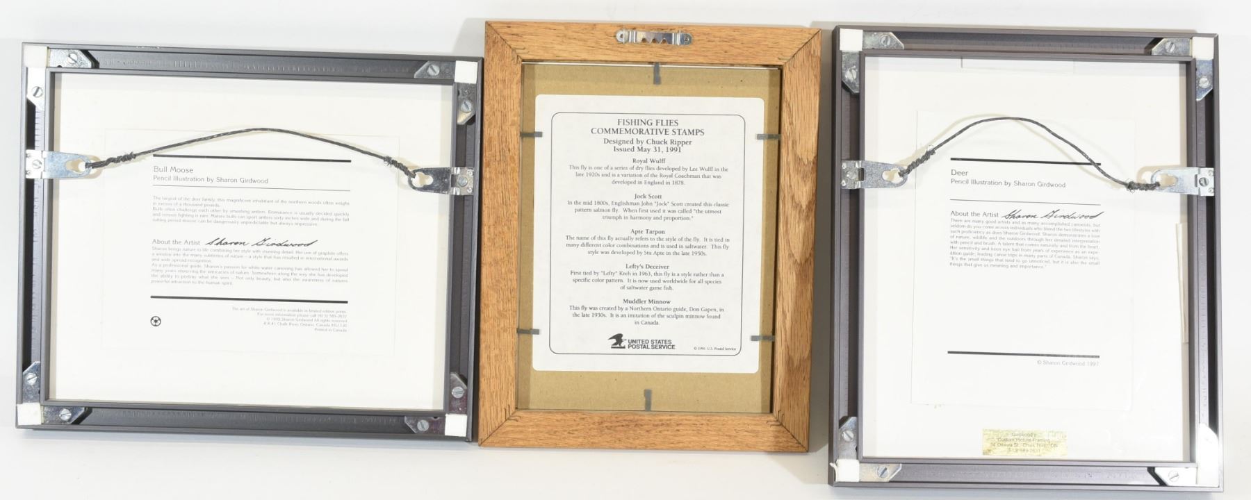 Pencil illustration of a bull moose and whitetail deer by Sharon Girdwood, 6" x 4 1/4" in a 9 1/2" x 8 1/4" frame, Fishing Flies commemorative stamps designed by Chuck Ripper issued May 31, 1991.