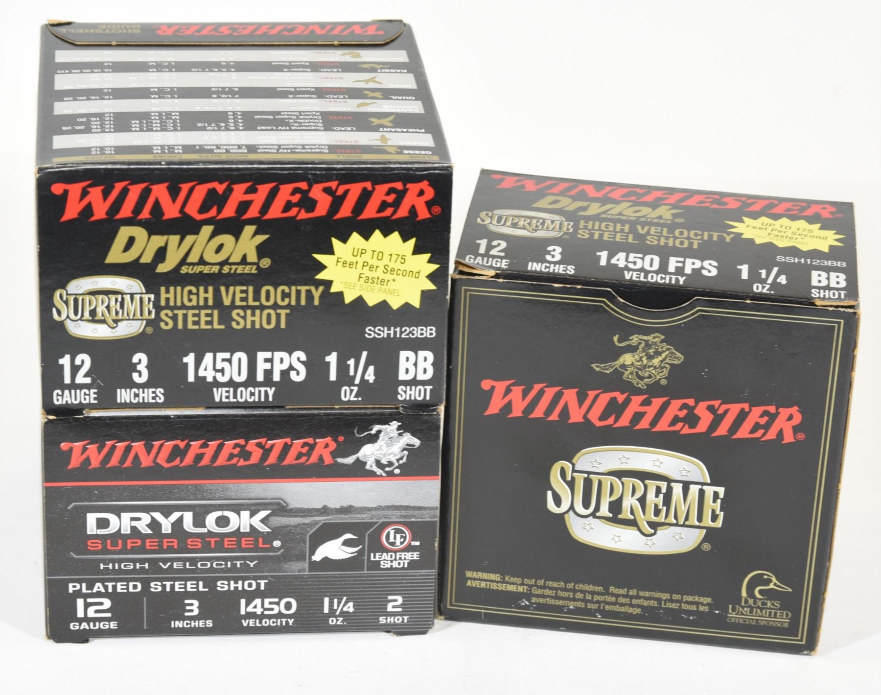Full box of Winchester Drylok Supreme High Velocity 12ga 3" BB. 24 round box of Winchester Drylok Supreme High Velocity 12ga 3" BB. One full box of Winchester Drylok Super Steel High Velocity 12ga 3" #2.