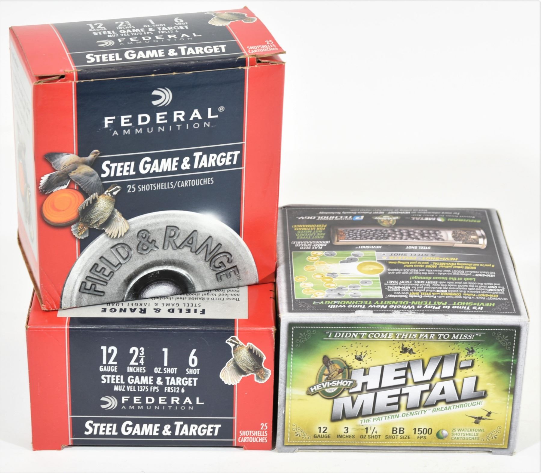 Full box of Hevi-Shot Hevi-Metal 12ga 3" BB. Two full boxes of Federal Steel Game and Target 12ga 2 3/4" #6.