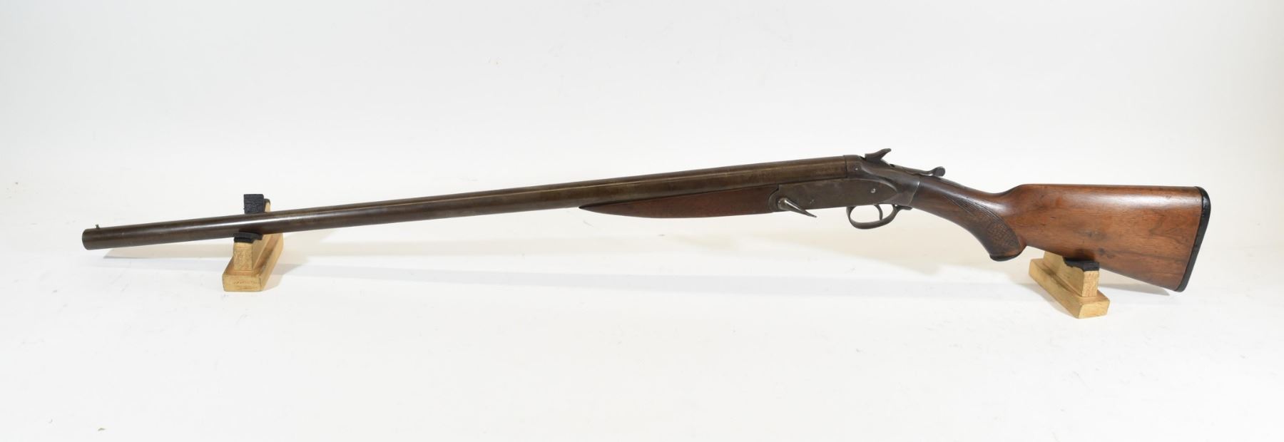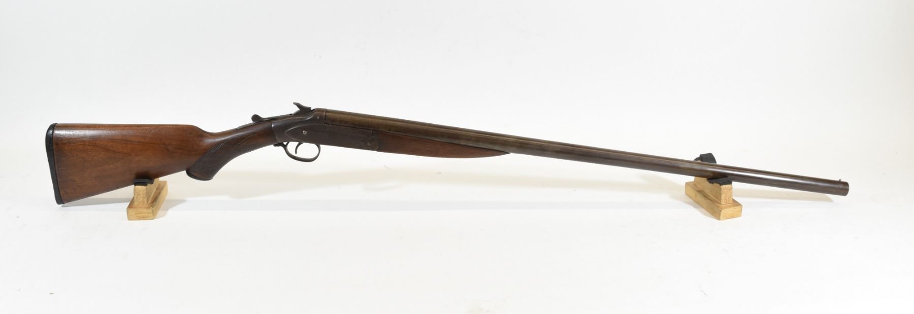 Non-Restricted, Challenge single shot 12ga shotgun. Unknown fixed choke. Wood stock has typical age marks with one crack on foregrip and two cracks near the upper tang. Domascus barrel has fading and bluing. Bore is scratched and pitted near chamber. S/N 4983354.
