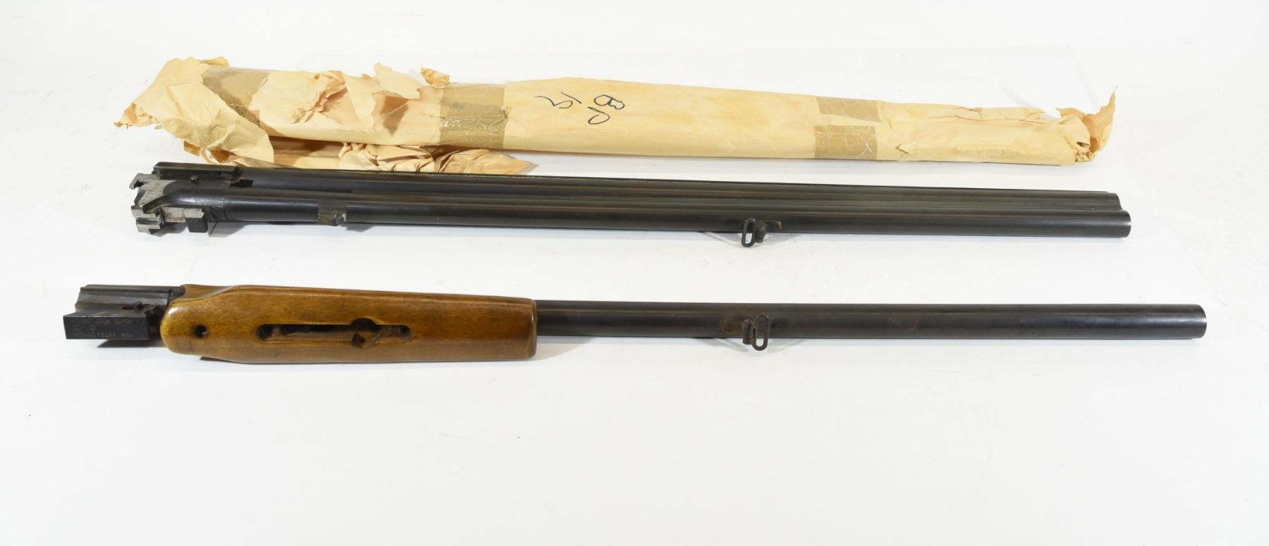 1) Baikal mod. IJ 18, 12 ga. 2 3/4", wooden fore-end is in good condition but missing locking mechanism, 29" full choke barrel, bluing is fair, bore is good. 2) Baikal IJ 27 12 ga. 2 3/4", 28" full & mod. vent rib barrel, bluing is good, bores are very good.