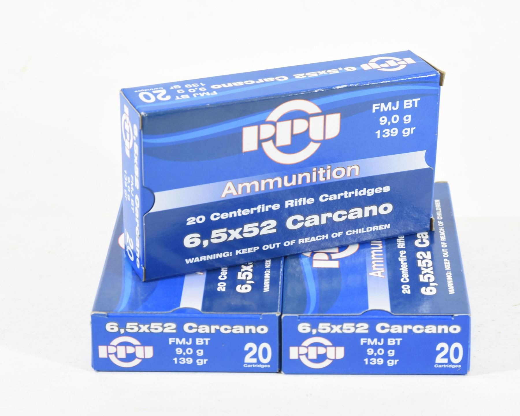 Three 20 round boxes of PPU 6.5 Carcano 139gr FMJ BT ammunition.