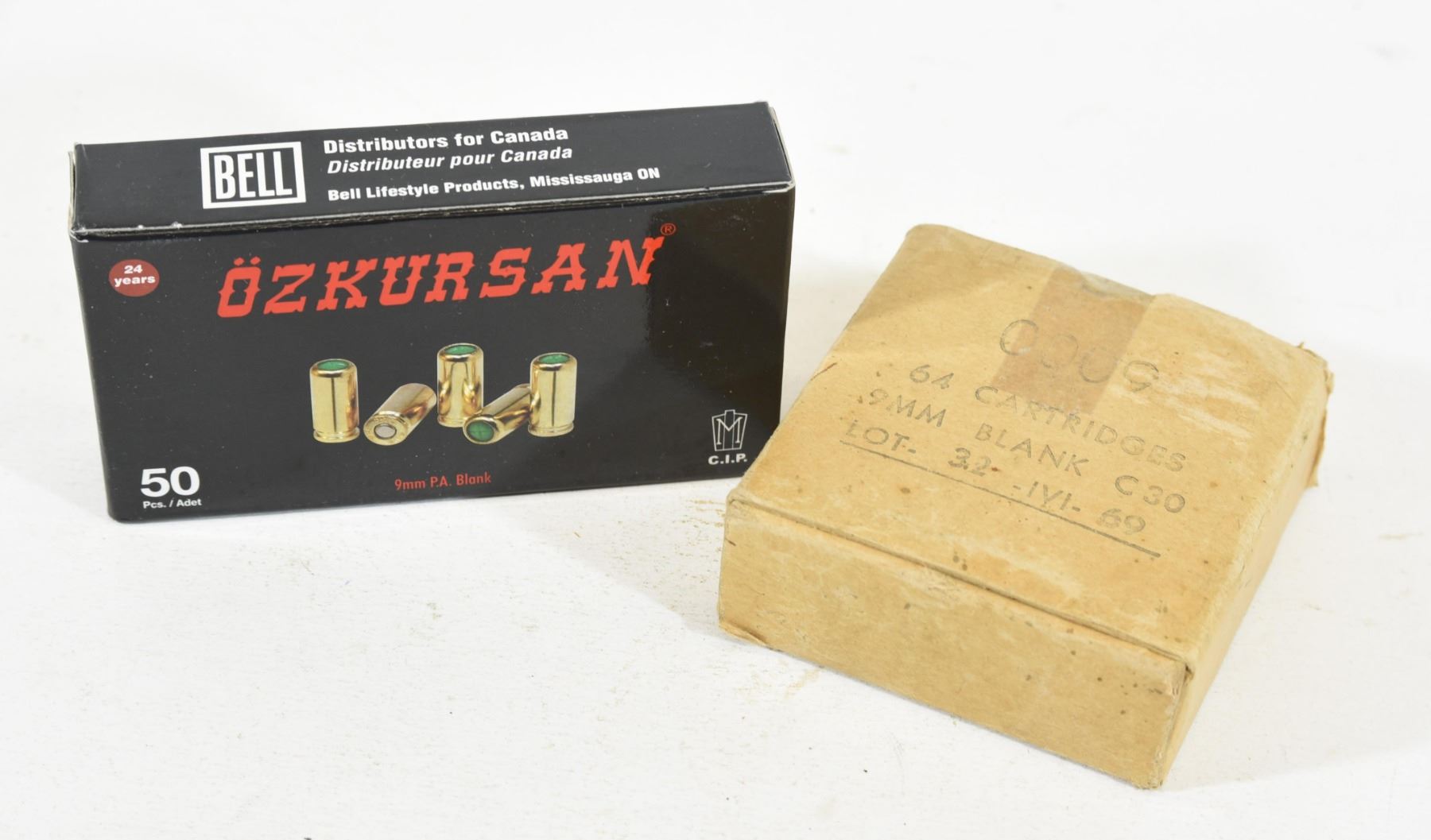 One 50 round box of Ozkursan 9mm blanks. One 64 round box of Canadian IVI 9mm Luger blanks.