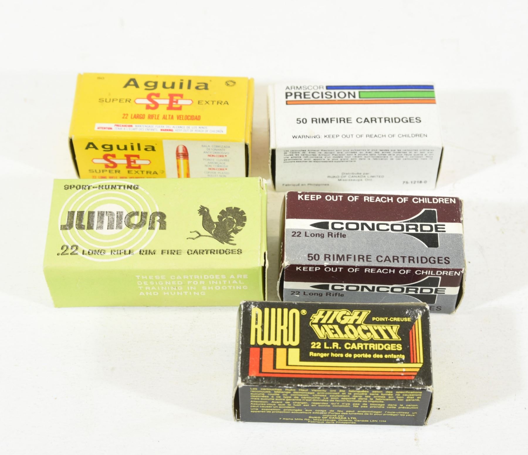 One 50 round box of Ruko High Velocity 22LR 37gr Hollow Point. One 50 round box of Kassnar Concorde 22LR 37gr Hollow Point. One 50 round box of Armscor Precision 22LR 40gr Solid Point. One 50 round box of Junior 22LR ammunition. One 50 round box of Aguila Super Extra 22LR Copper Plated ammunition.