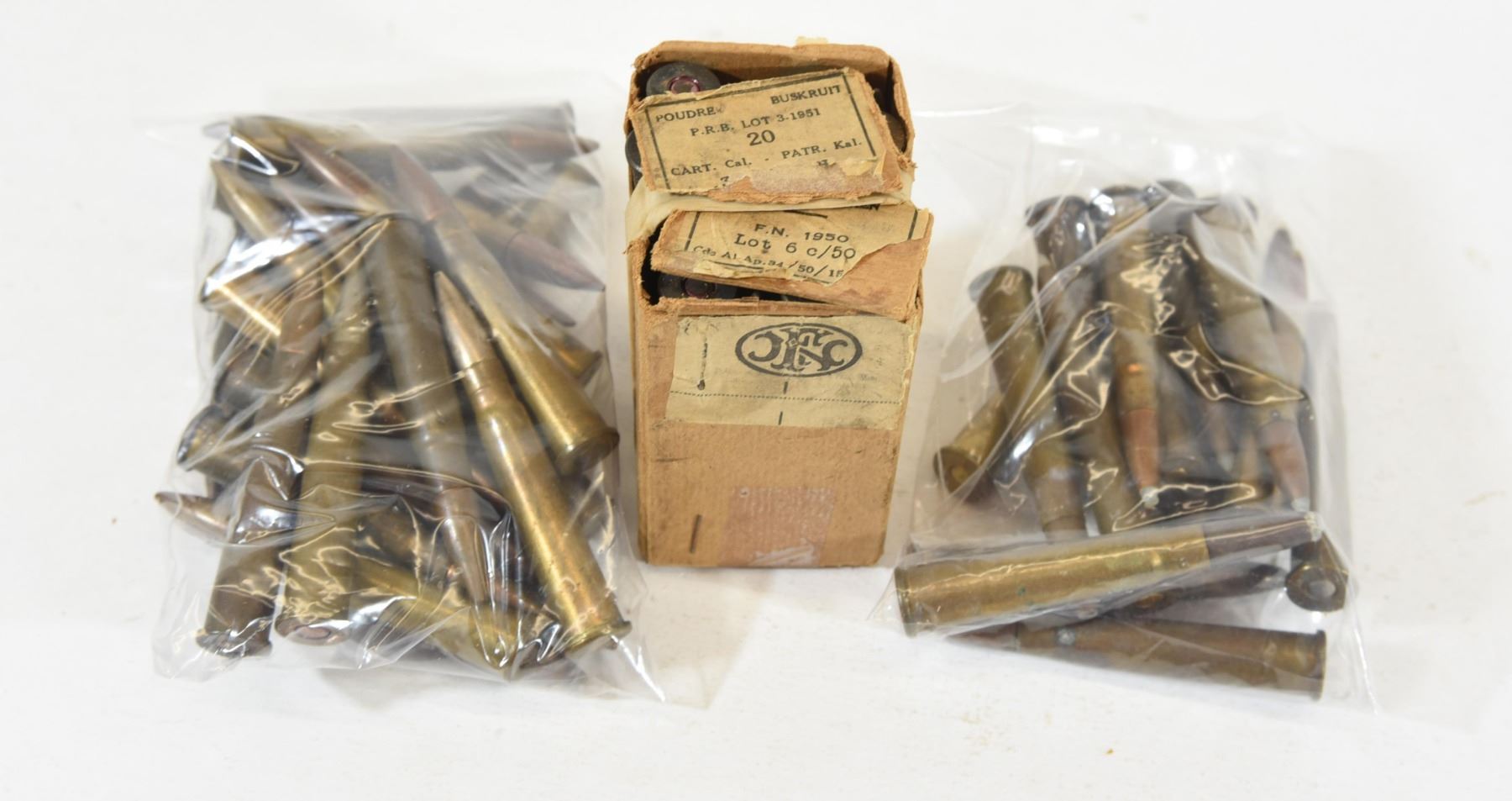 20 rnds. in a vintage box marked F.N. 1950, 40 rnds. with different head stamps.