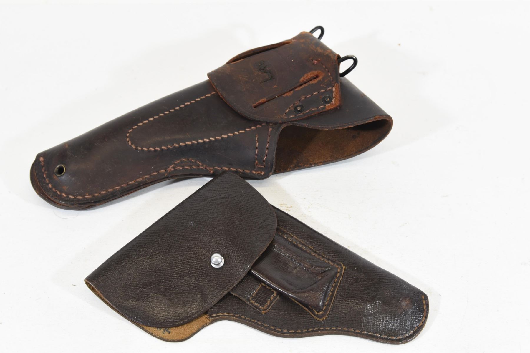 1) Original WWII 1911 U.S. Army holster made by Warren Leather Goods U.S.A.. In good condition but has initials carved on the belt loop. 2) Beretta mod. 34 7.65mm pistol holster.