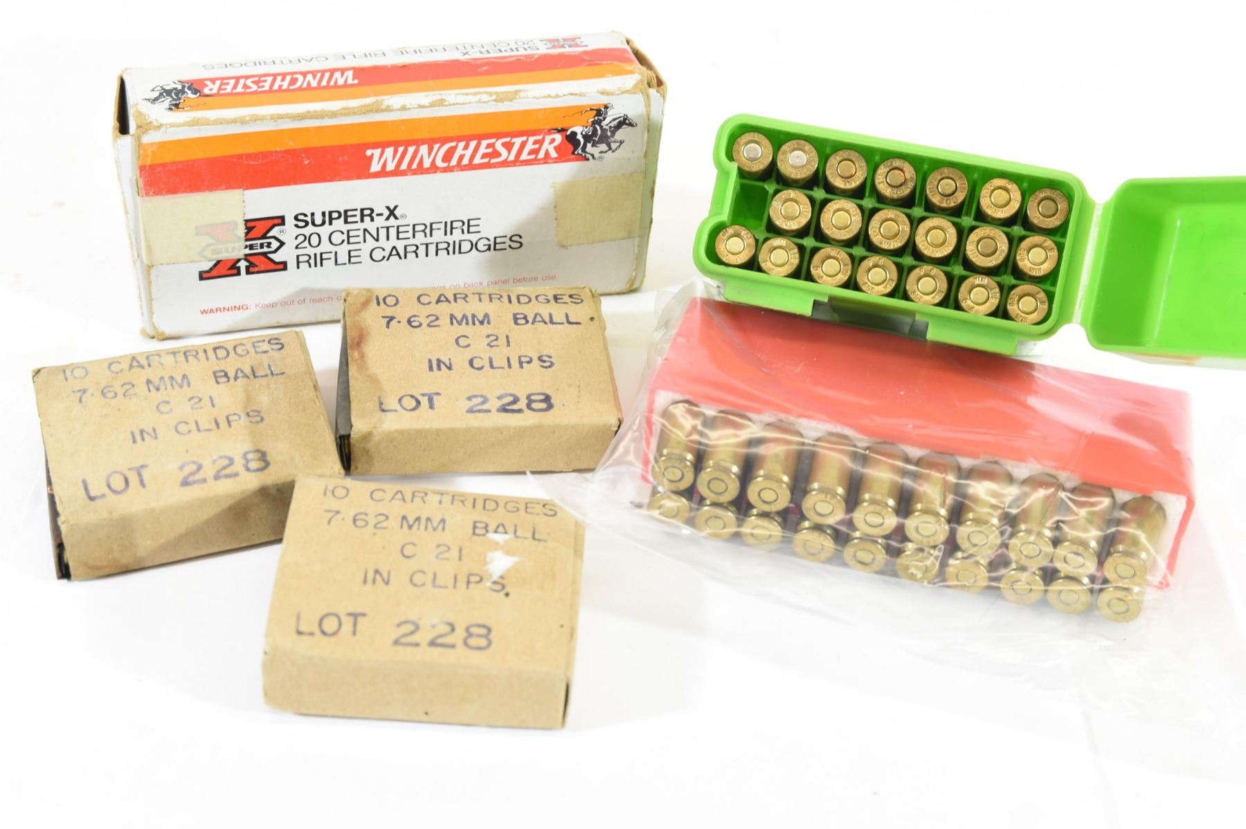 20 round box of Winchester Super-X 180gr Silvertip ammunition. Three 10 round boxes of 7.62mm Ball in Stripper Clips. 20 round Case Guard of 308 Win ammunition. 20 round tray of 308 Win ammunition.