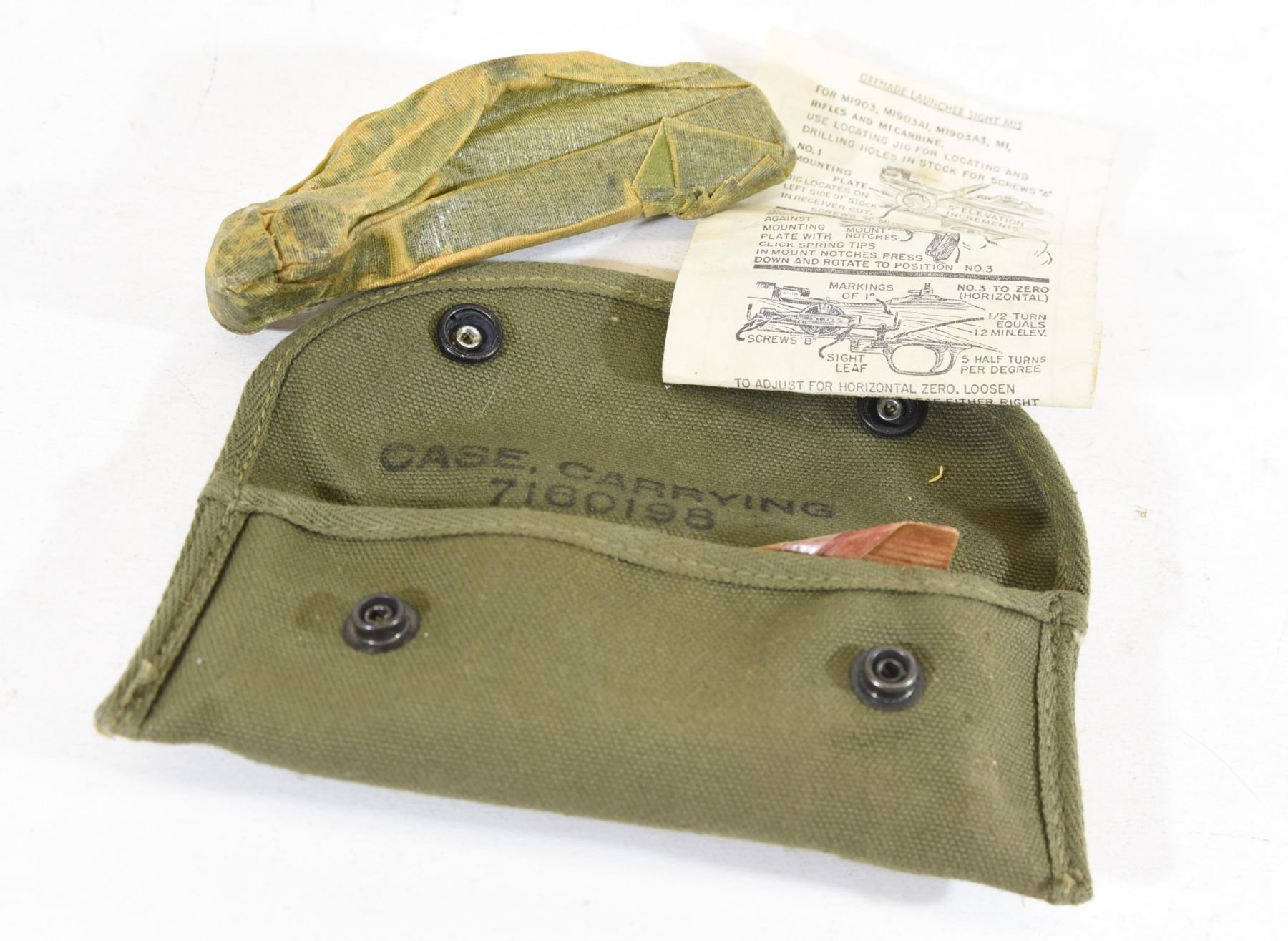 M1 Garand grenade launcher sight still in grease package and canvas belt pouch.