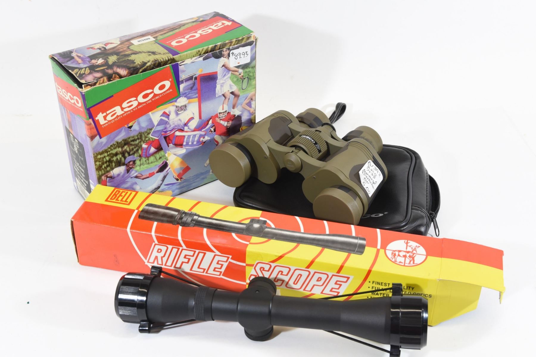 Set of Tasco 7 x 35mm wide angle rubber armored binoculars with case and box (as new) and a Bell 4 x32mm rifle scope in very good condition.