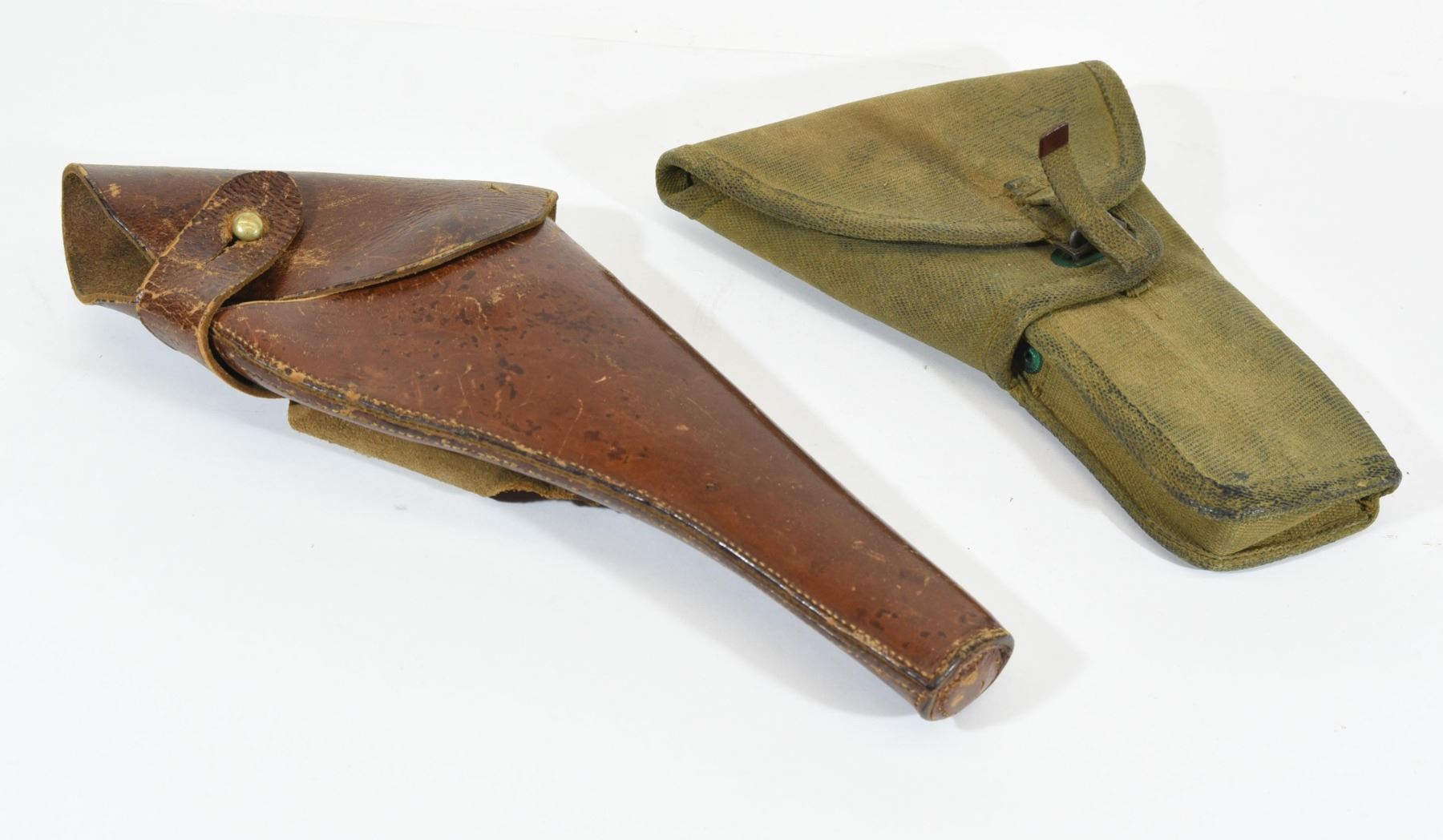 1) British WW1 455 revolver holster, showing wear 2) WW11 Canadian Inglis 9mm Hi power holster, showing wear