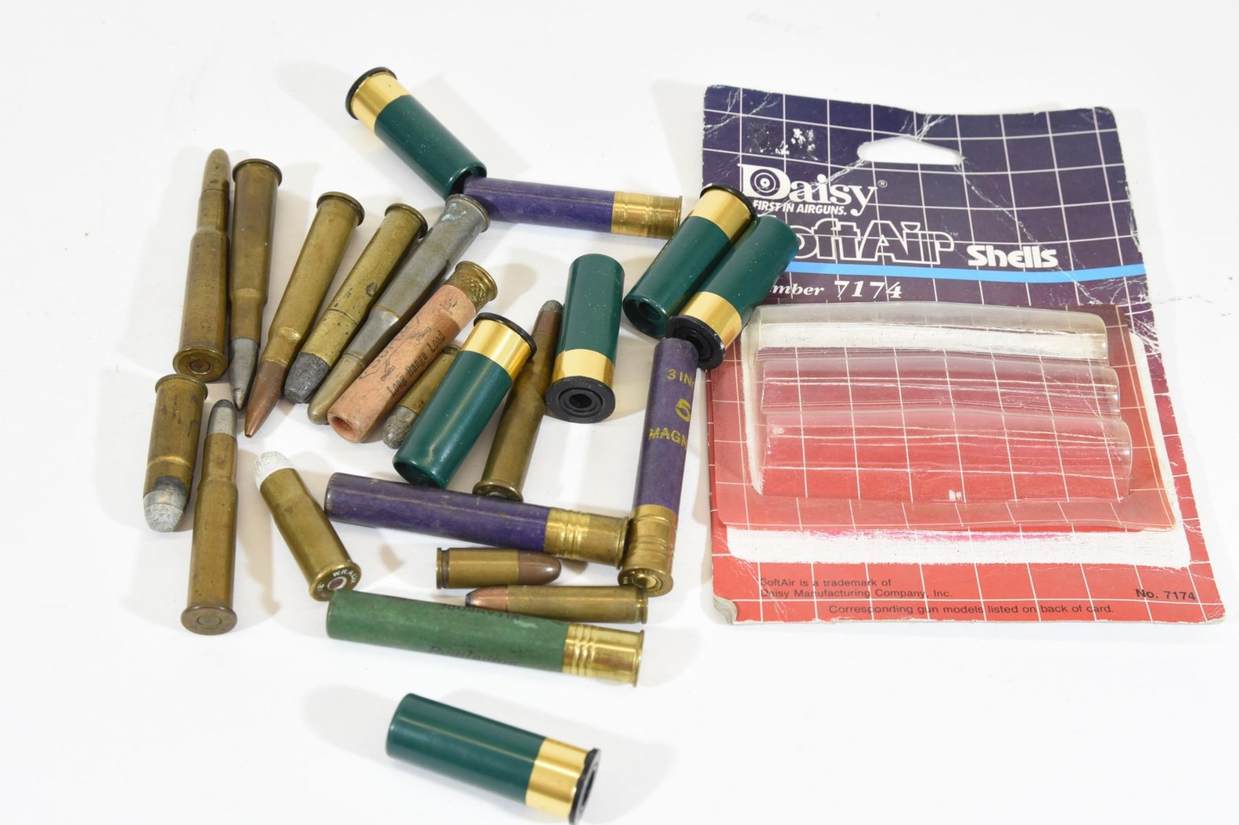 2 rounds of 30-40 Kraig ammunition. 5 paper 410ga shotshells. Round 38 WCF. Round 44 WCF. One round 30 WCF. One round 38-55. One round 38 C.A. One round 303 British. One round 32 W.S. One round 30 ARMY. One round 30 Carbine. One round 9mm Luger. Six Daisy SoftAir Shells.