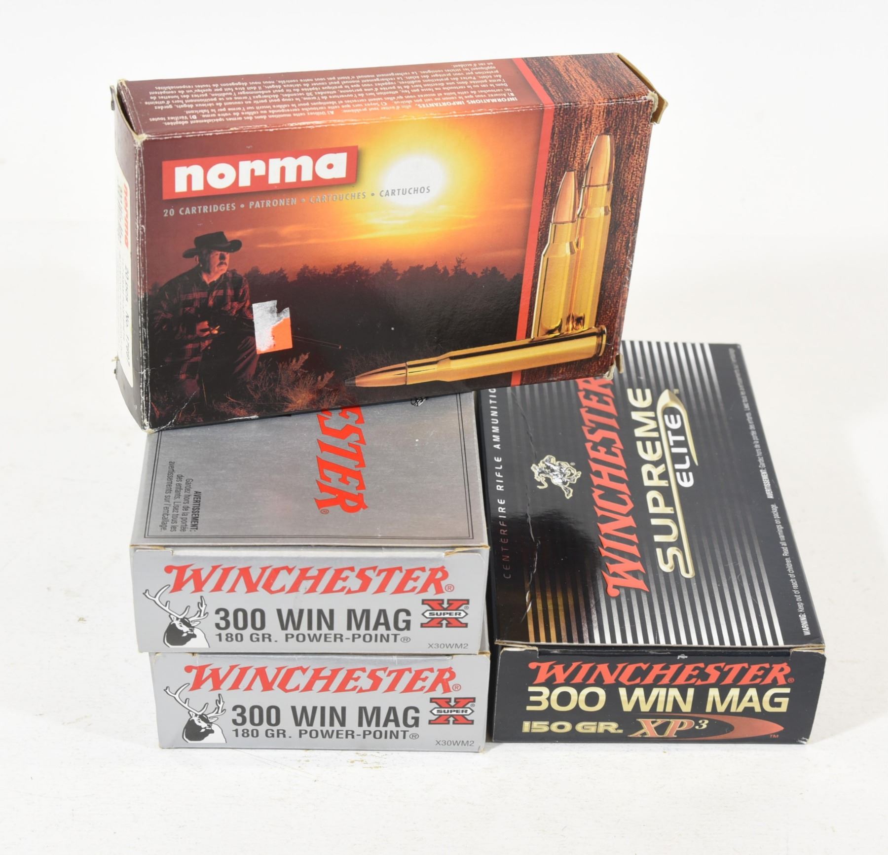 Two 20 round boxes of Winchester Super-X 300 Win Mag 180gr Power-Point. 20 round box of Winchester 300 Win Mag 150gr XP3. 20 round box of Norma 300 Win Mag 180gr Plastic Point.