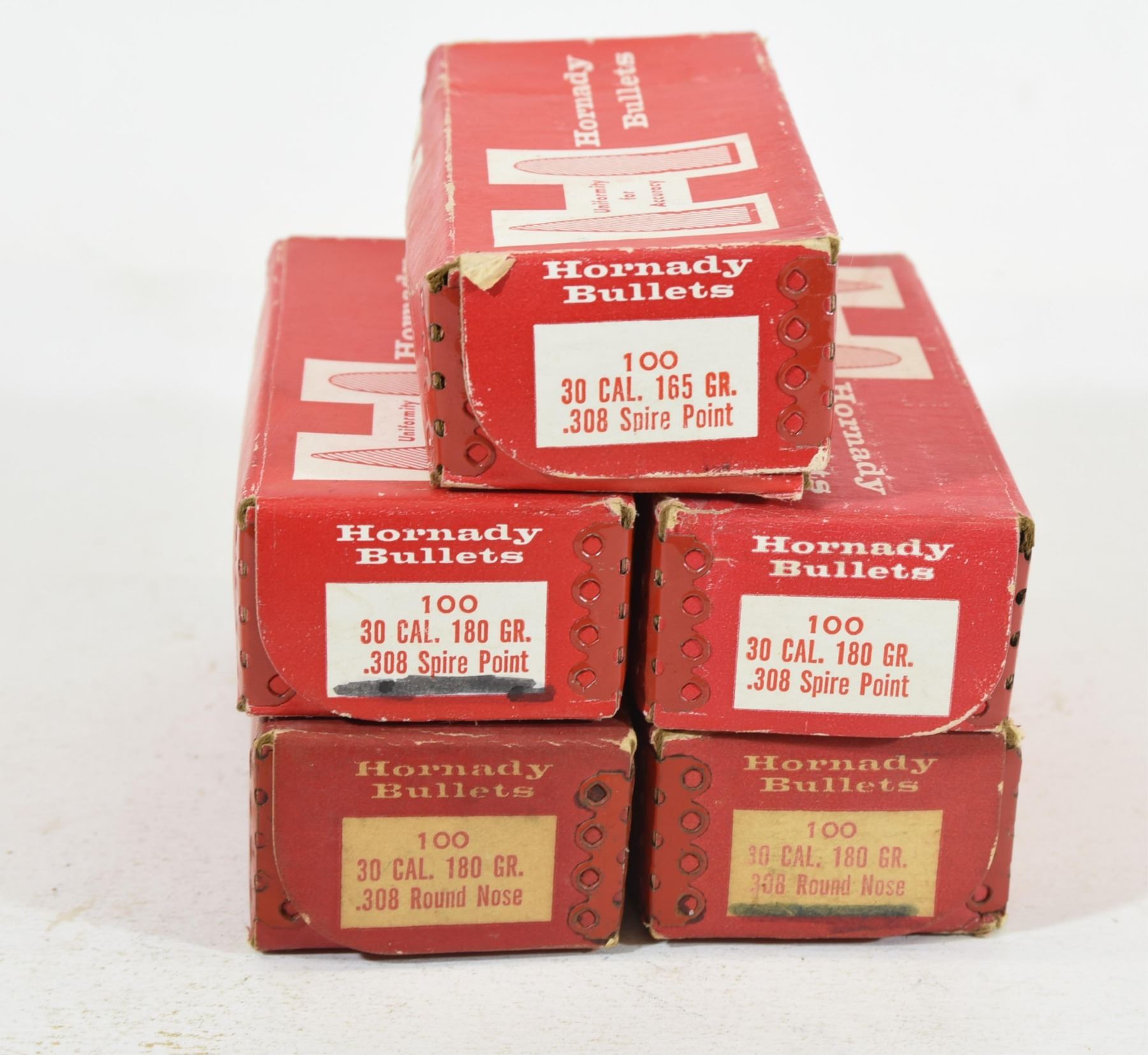 Two full boxes of Hornady 30cal (308) 180gr Spire Point bullets. Two full boxes of Hornady 30cal (308) 180gr Round Nose bullets. One part box (unknown quantity) Hornady 30 cal (308) 165gr Spire Point bullets.