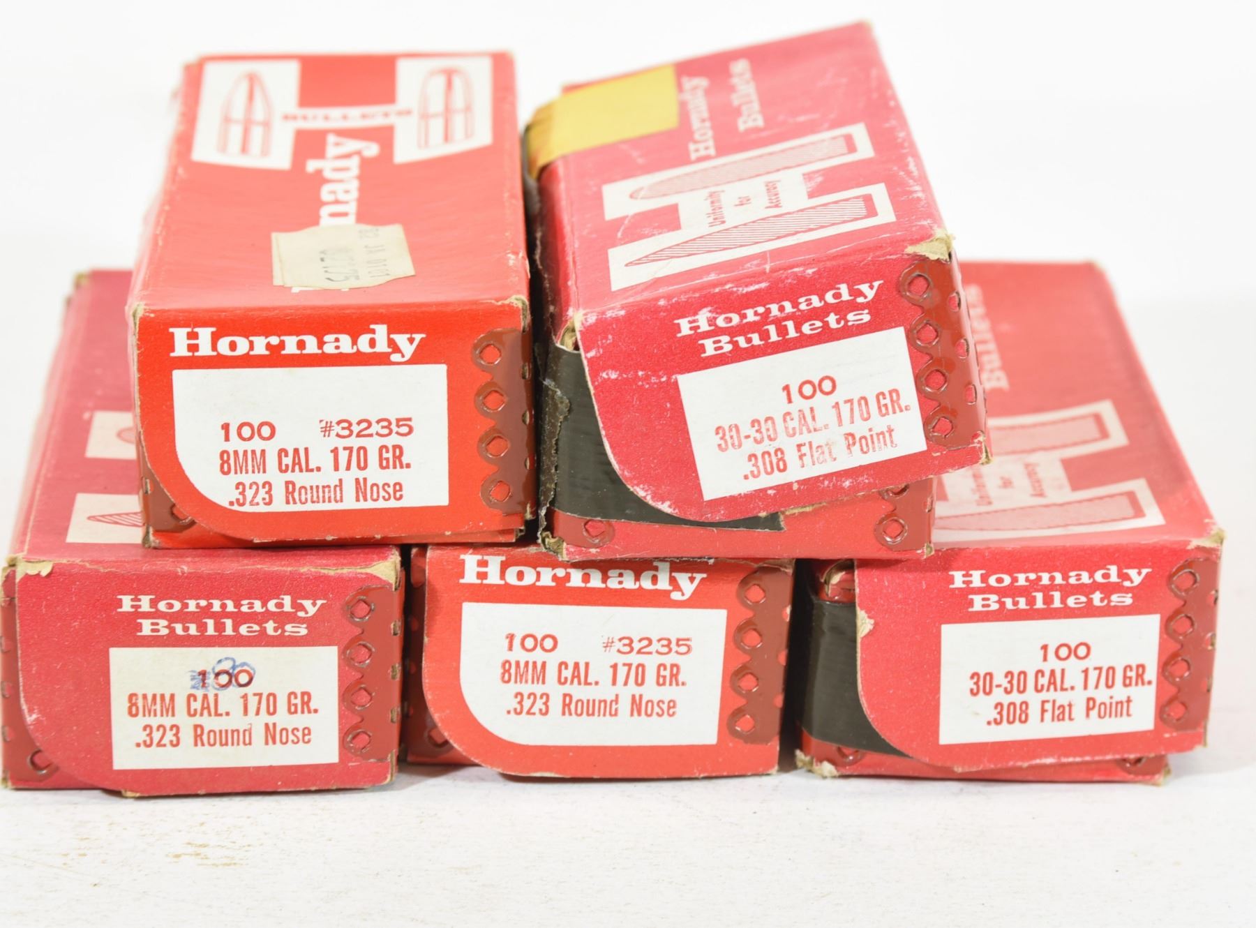 2.3 lb box of Hornady 30-30cal (308) 170gr Flat Point bullets. 2.65 lb box of Hornady 30-30cal (308) 170gr Flat Point bullets. One factory sealed box of Hornady 8mm cal (323) 170gr Round Nose bullets. One 1.5lb box of Hornady 8mm cal (323) 170gr Round Nose bullets. One 2.5lb box of Hornady 8mm cal (323) 170gr Round Nose bullets.