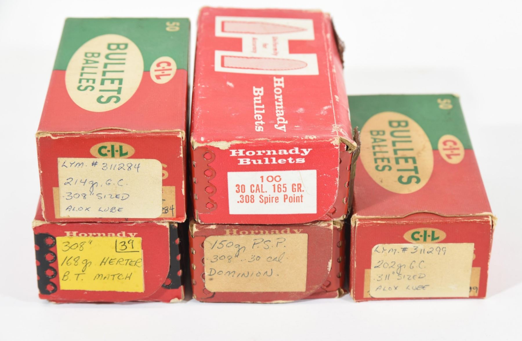 1.2 lb box of Lyman #311284 .308" 214gr G.C. Alox Lubed bullets. 1.25 lb box of Lyman #311299 .311" 202gr G.C. Alox Lubed bullets. One 0.8 lb box of .308" 168gr Herter B.T. Match bullets. One 2.45 lb box of Hornday 30cal .308" 165gr Spire Point bullets. One 2.4 lb box of Dominion 30cal .308" 150gr P.S.P. bullets.