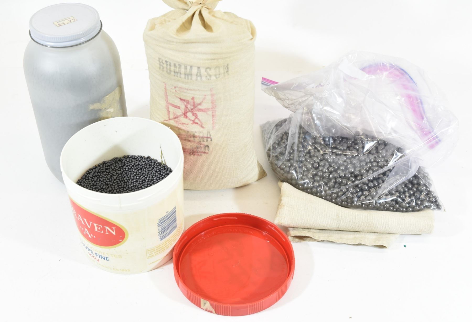 18.5 lbs bag of #6 lead shot. 6.15 lbs bag of #7.5 lead shot. 6.7 lbs bag of unknown size lead shot. 10.45 lbs bottle of unknown size lead shot. Empty shot bag.