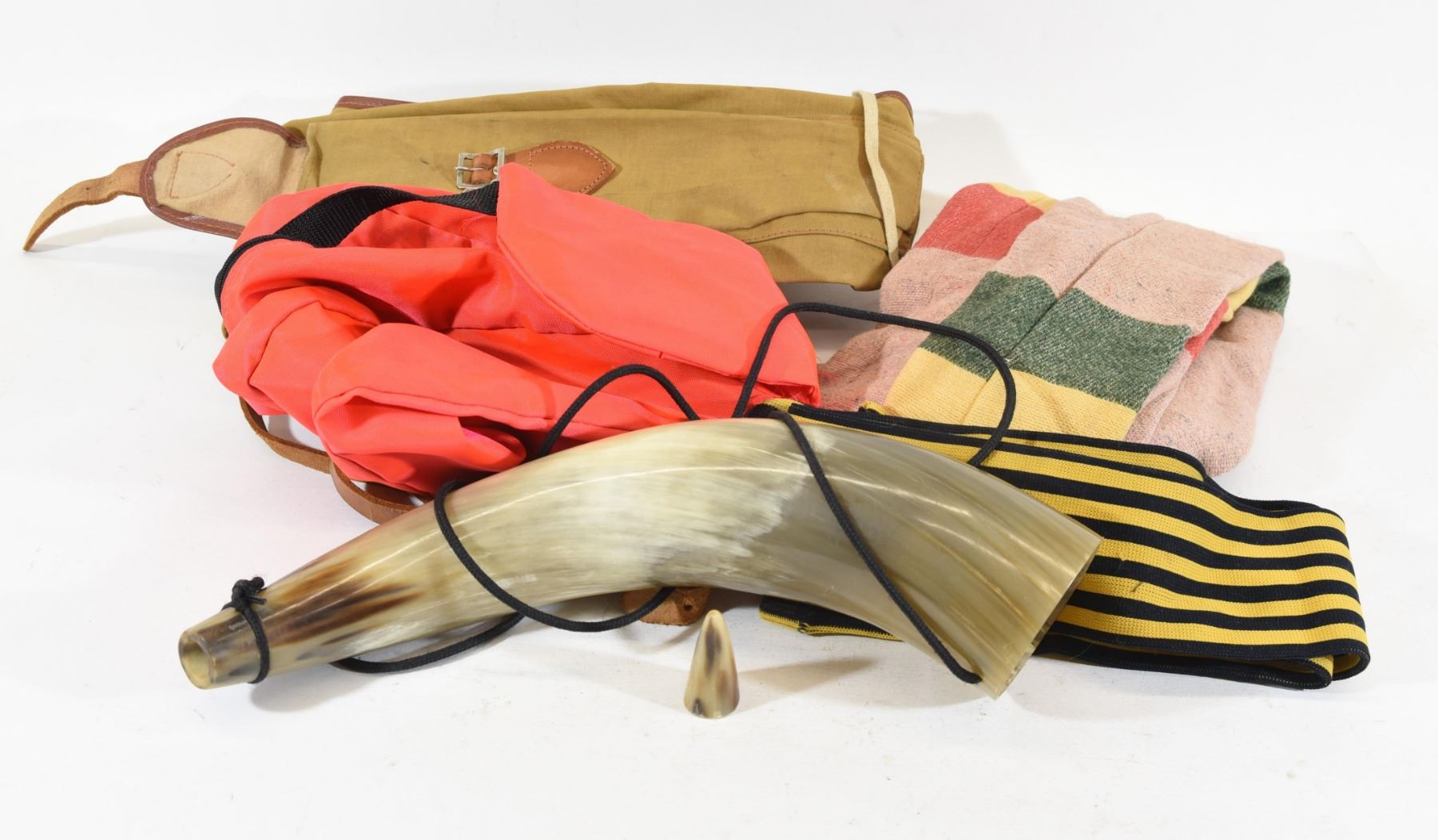 1 vintage gun case, 1 gun sock, 1 handmade gun case, 1 blaze orange fanny pack, 1 incomplete powder horn.
