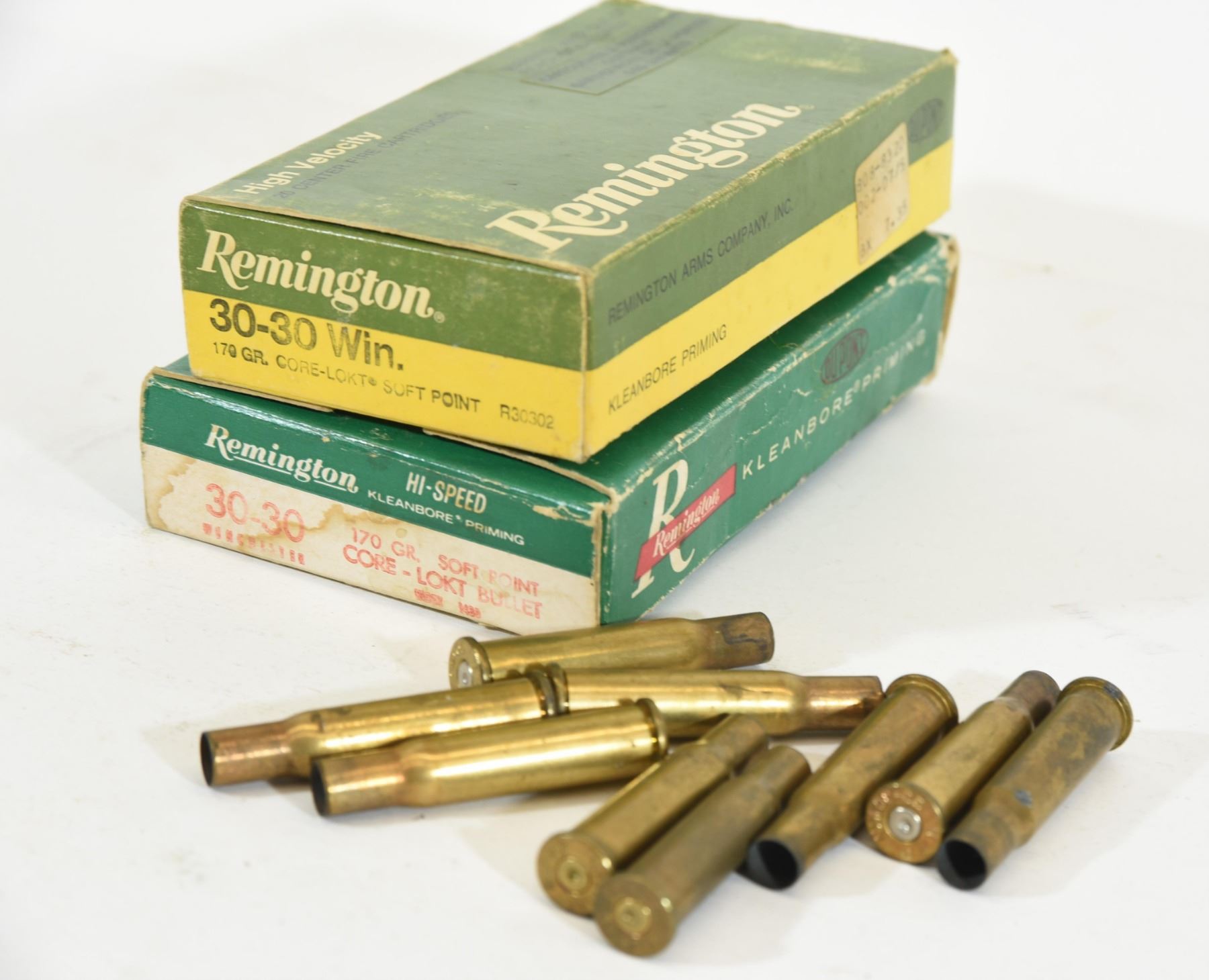 20 piece box of Remington Hi-Speed 30-30 Win brass. 20 piece box of Remington High Velocity 30-30 Win brass. 9 loose pieces of 30-30 Win brass.