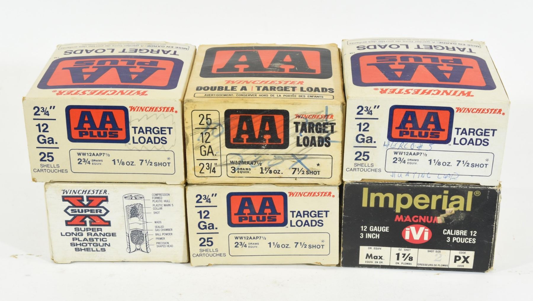 Box of Winchester AA Target Loads 12ga 2 3/4" #7.5 with 10 shells inside. Winchester AA Plus 12ga Target Loads with 5 Peters 21ga shotshells, 5 Winchester AA Plus #7.5 shotshells, and 12 Winchester AA Plus #8 shotshells inside. Winchester Super-X 12ga with 7 Winchester AA # 8 shotshells and 6 Winchester AA #7.5 shotshells inside. Imperial 12ga box with 16 12ga Winchester AA 2 3/4" #8 shotshells and 9 12ga Winchester AA 2 3/4" #7.5 shotshells inside. Winchester AA Plus box with 9 Winchester AA 12ga 2 3/4" #8 shotshells and 16 12ga Winchester AA 2 3/4" #7.5 shotshells inside.