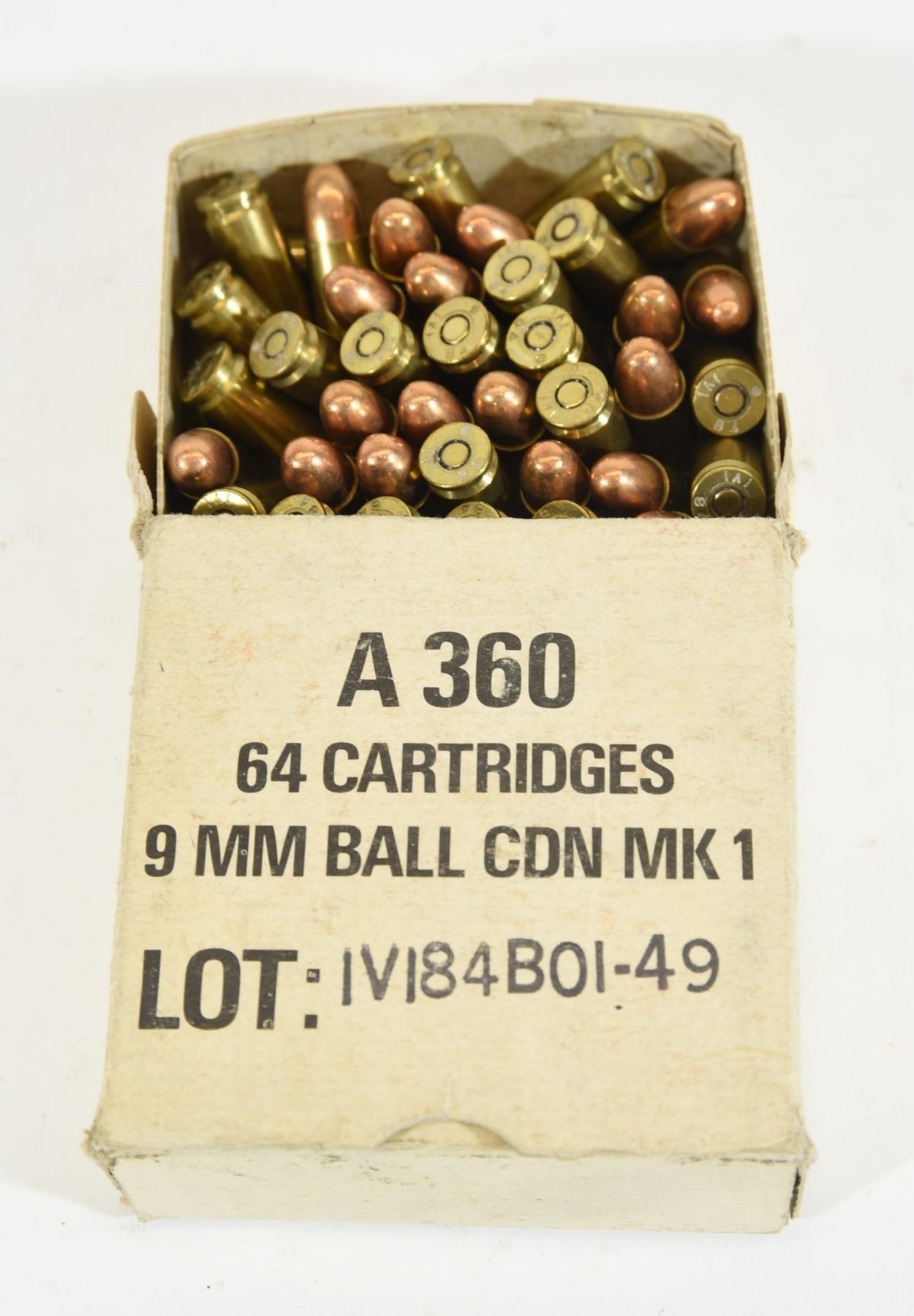 Box labeled "A 360 64 cartridges, 9mm Ball CDN MK 1, Lot: IVI84B10-49" with 46 rounds inside.