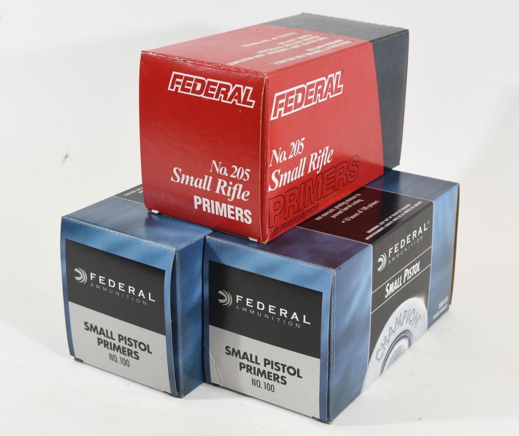 1000 piece box of Federal small pistol primers. 712 piece box of Federal small rifle primers. 972 piece box of Federal small pistol primers.