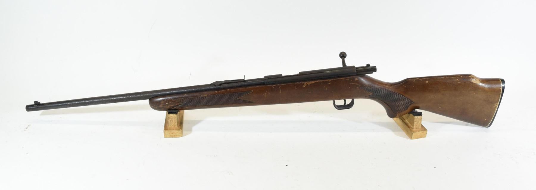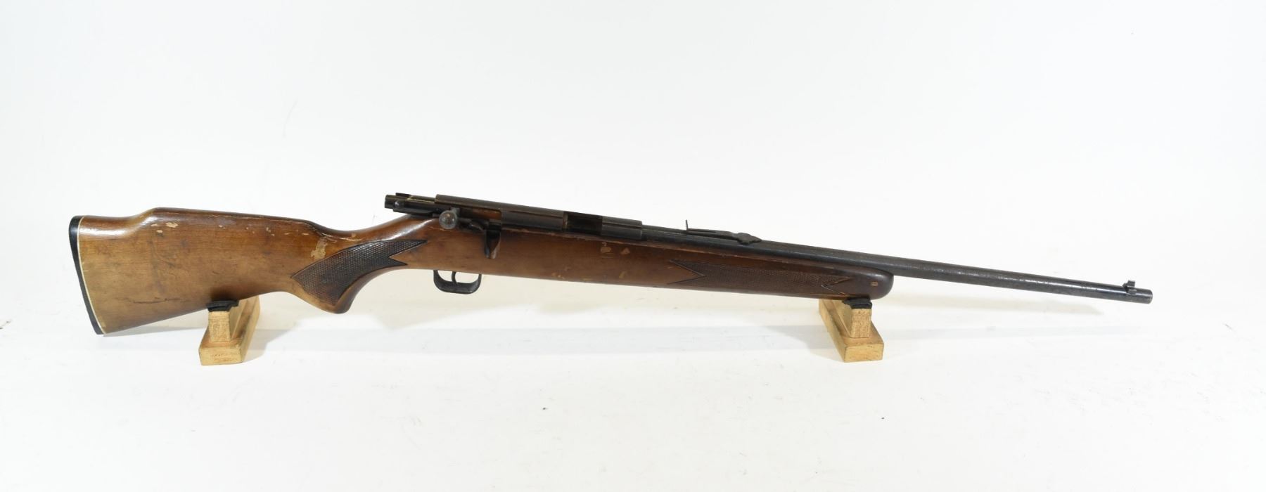 Non-Restricted, LakeField 22LR Bolt Action Rifle. Wood stock has chipped finish and small scratches on butt stock. Bluing is rusted. Bore is excellent. S/N 261090. Missing magazine.