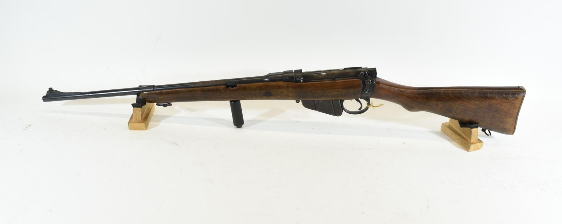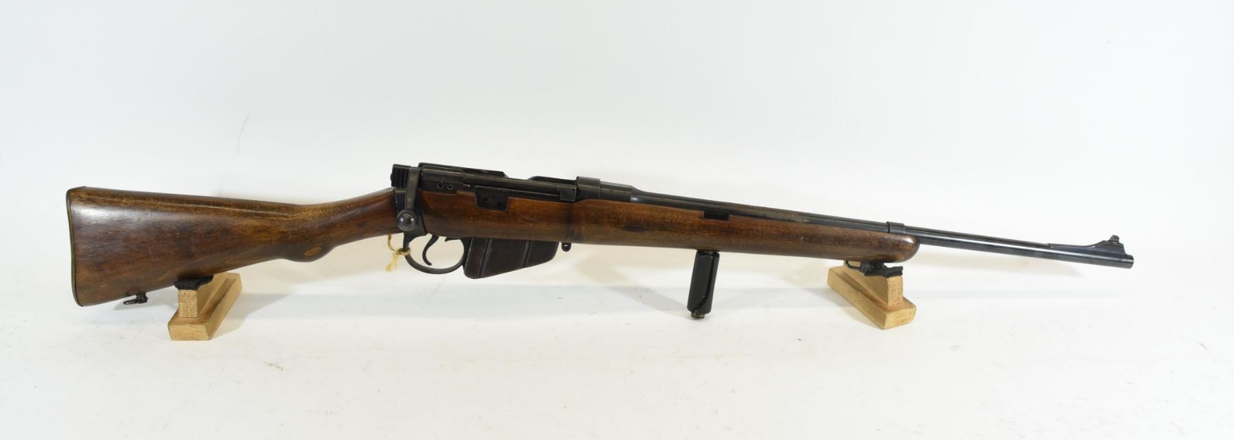 Non-Restricted, Sporterized Lee Enfield 1917 Mark III* 303British Bolt Action Rifle. Wood stock is good overall, but has several dents with a few small scratches and a set of initials engraved in front of magazine. Bluing going brown with one large bare patch and light rusting. Bore is good. S/N 56946.