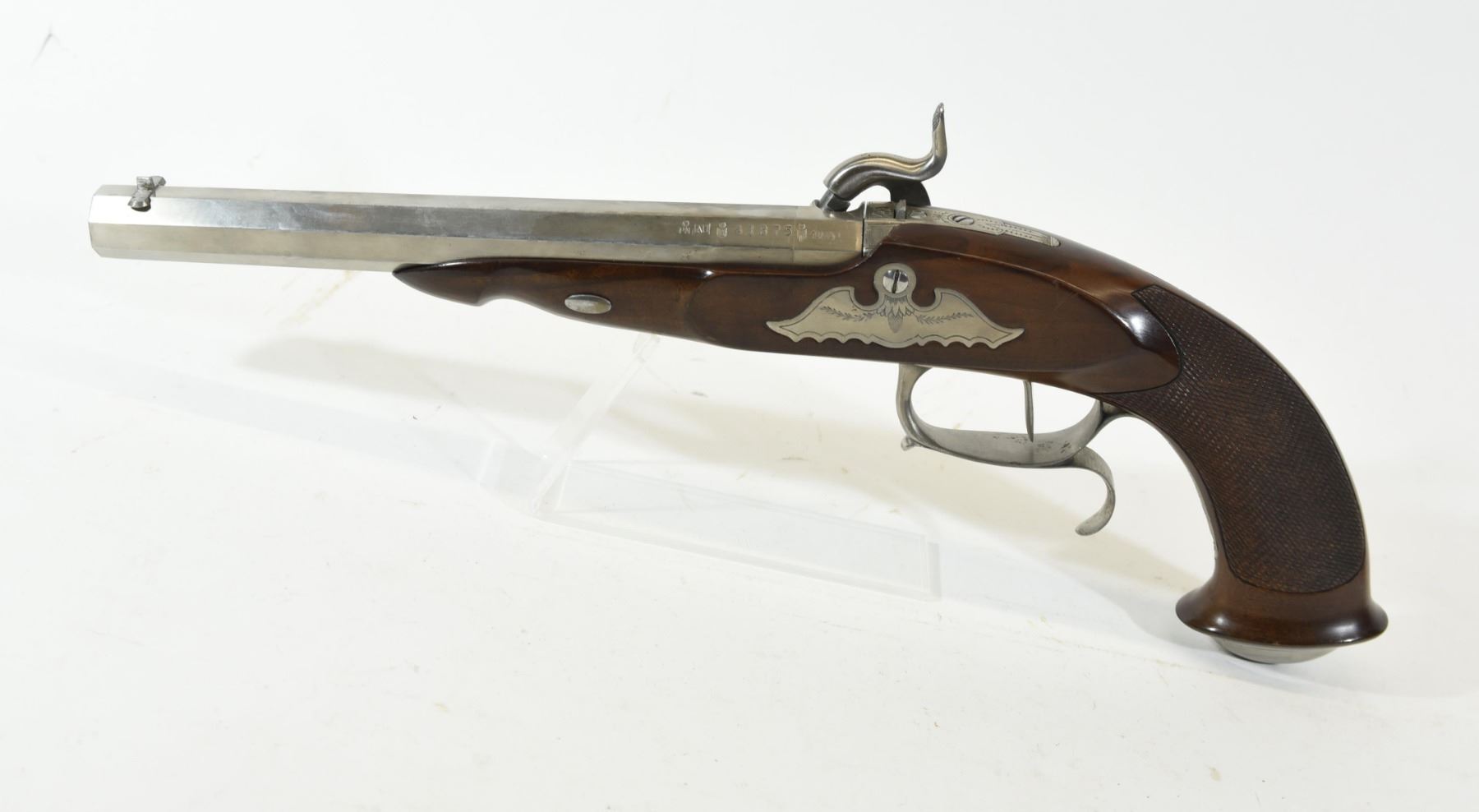 Restricted, single shot, 44 Percussion, 193mm barrel. SN 41875. Wood has a couple of scratches, metal frame has some small pi marks, bore very good.
